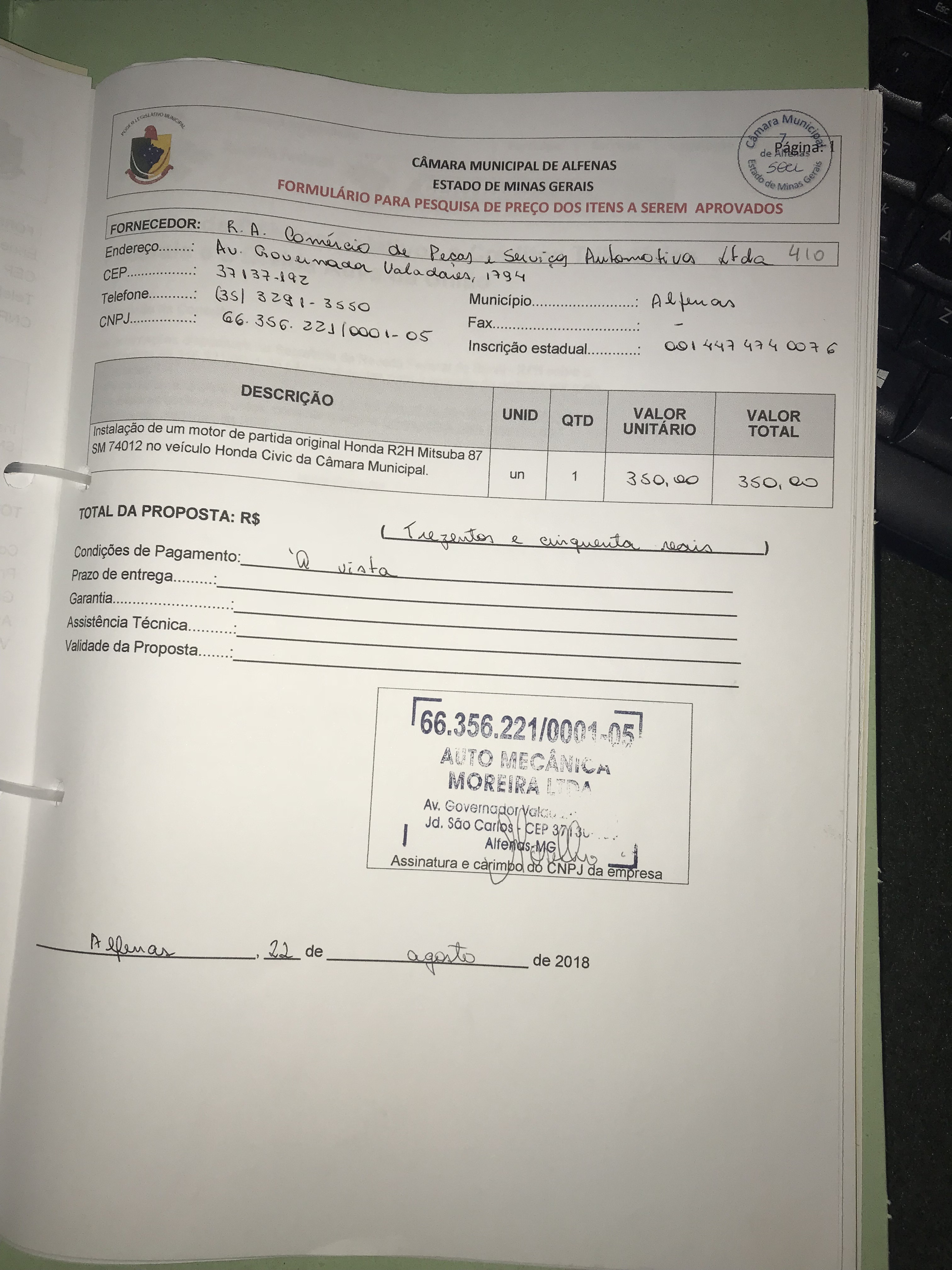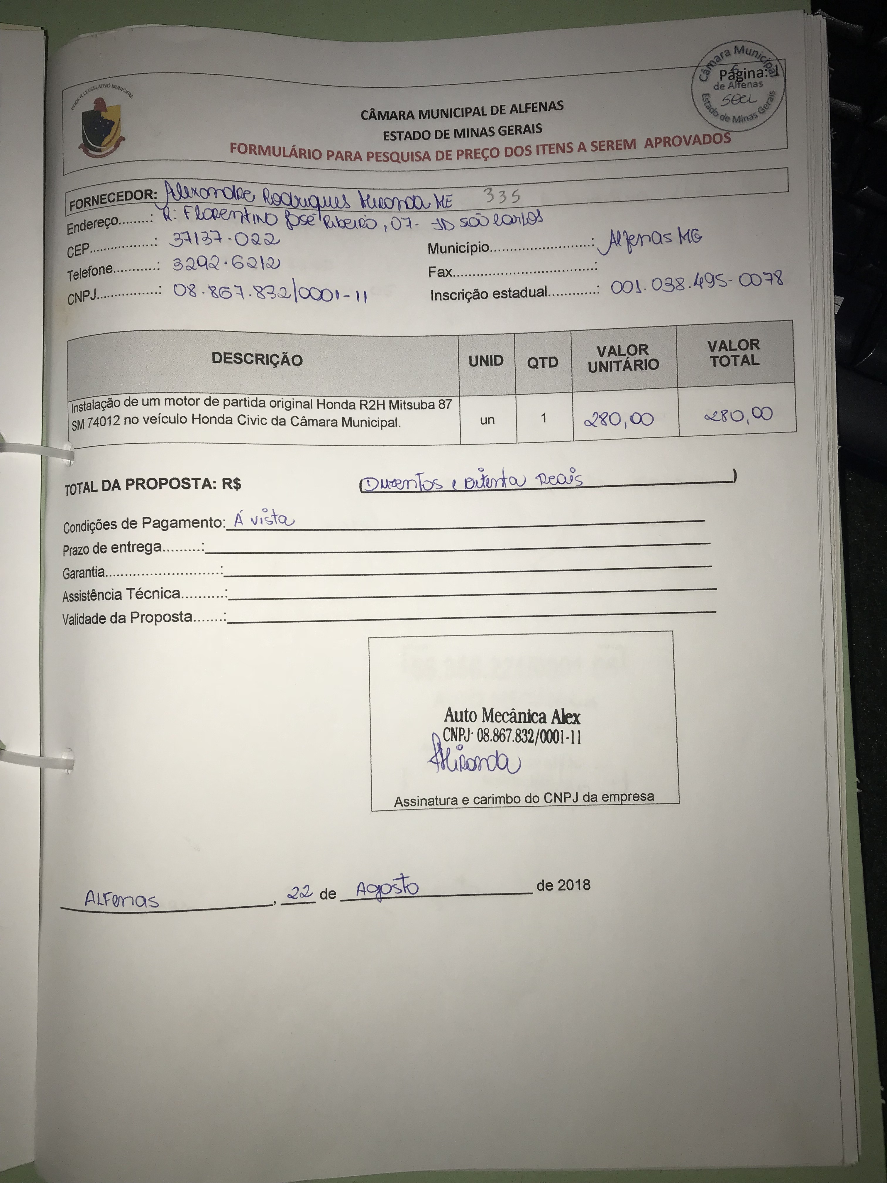 Serviço de instalação de motor de partida no veículo Honda Civic da Câmara Municipal de Alfenas