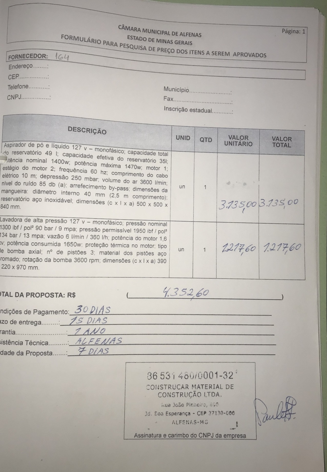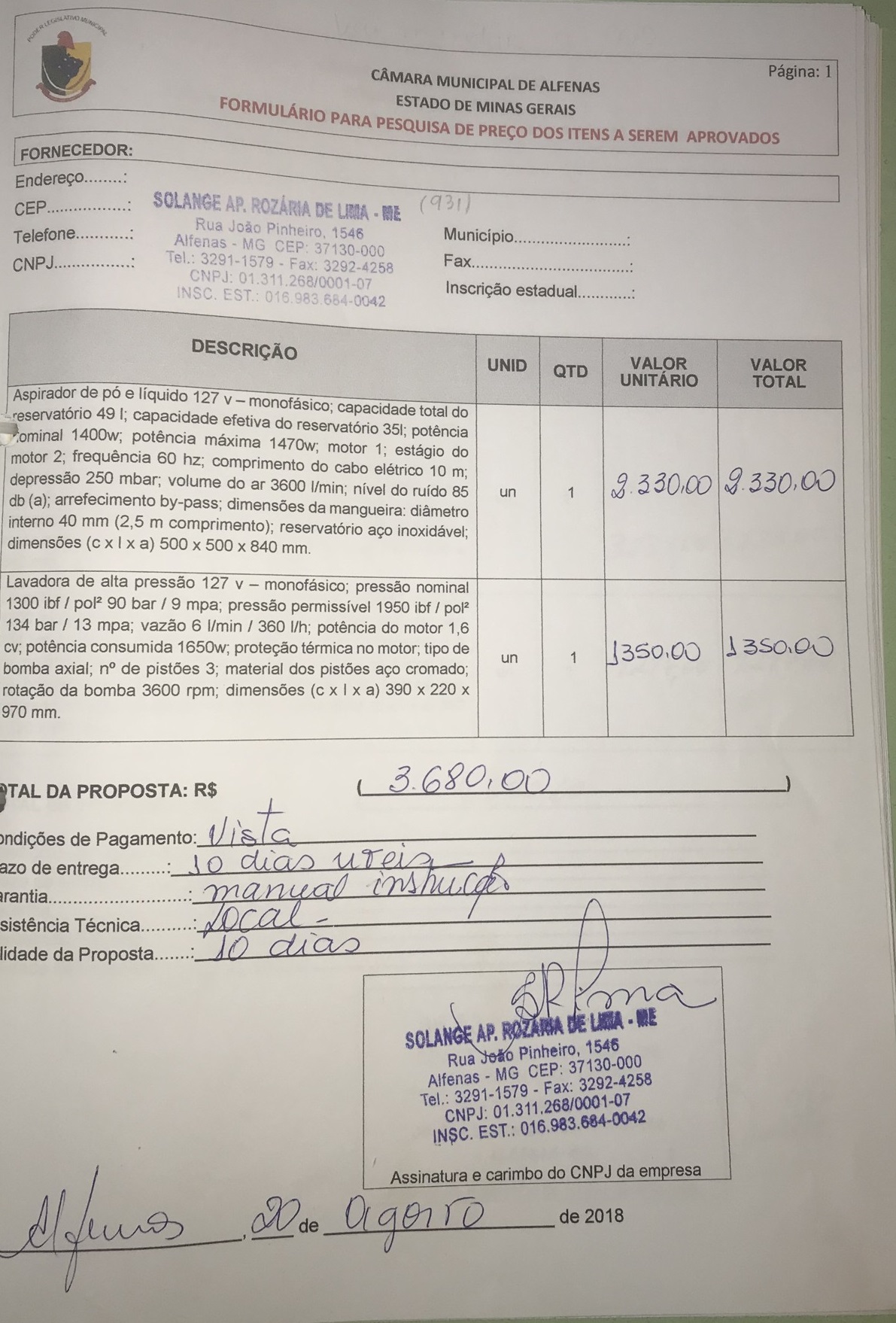 Aquisição de um aspirador de pó e líquido e uma lavadora de alta pressão