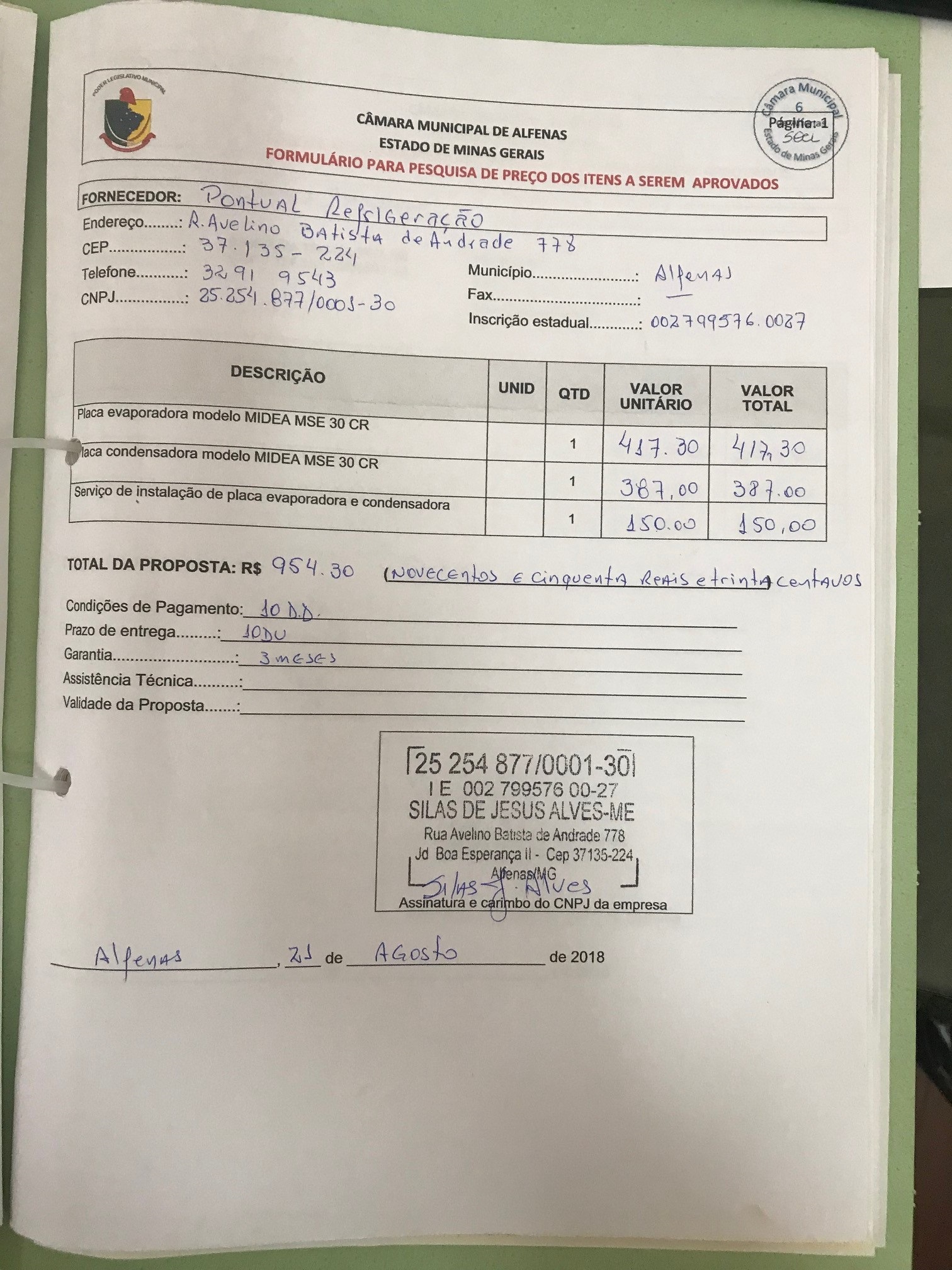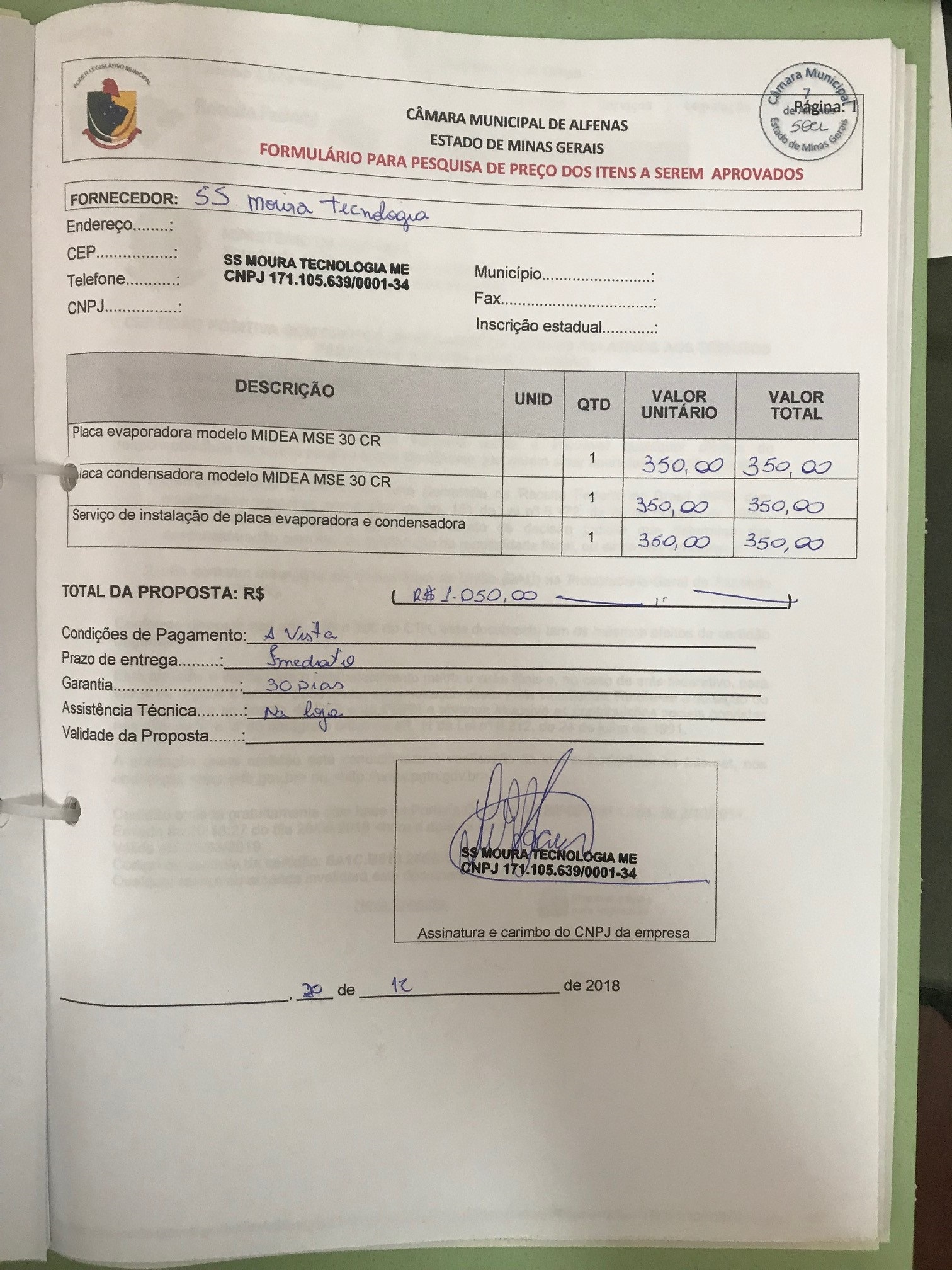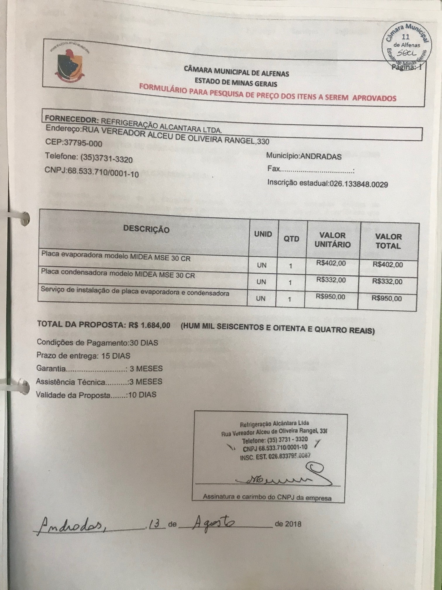 Aquisição de uma placa evaporadora, uma placa condensadora e instalação das mesmas no ar condicionado do plenário da Câmara Municipal
