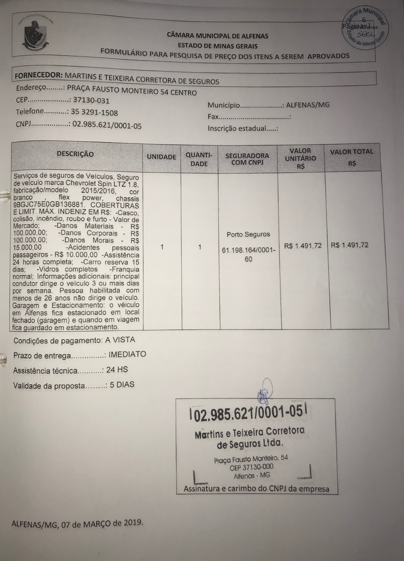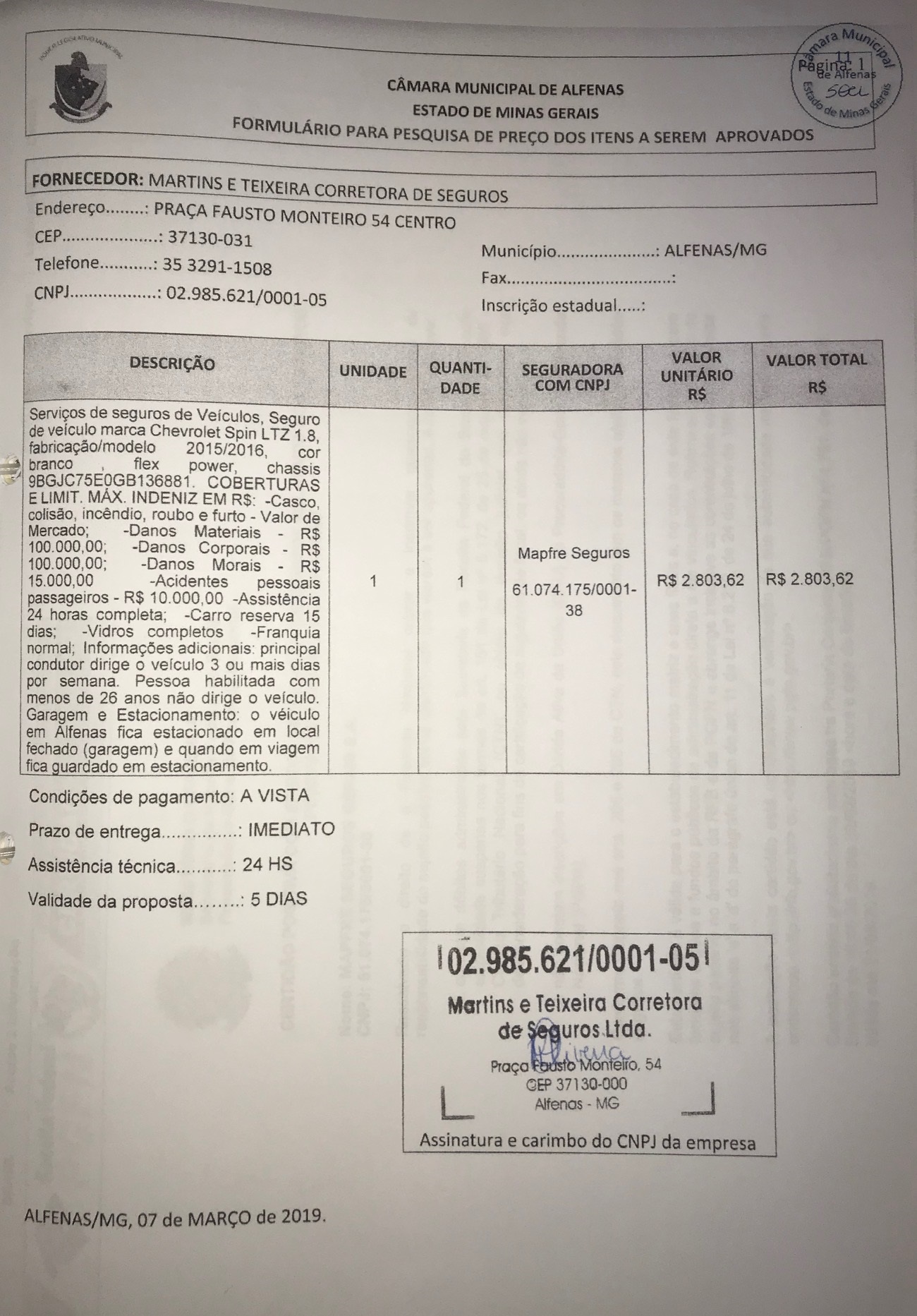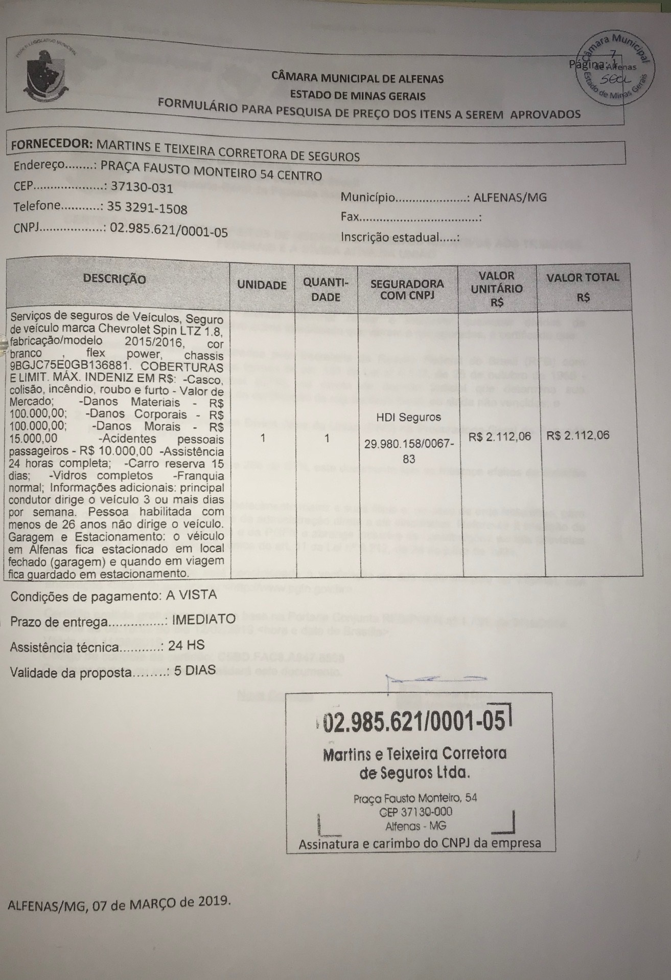 Contratação de seguro para veículo Chevrolet Spin placa PXO-2811 da Câmara Municipal