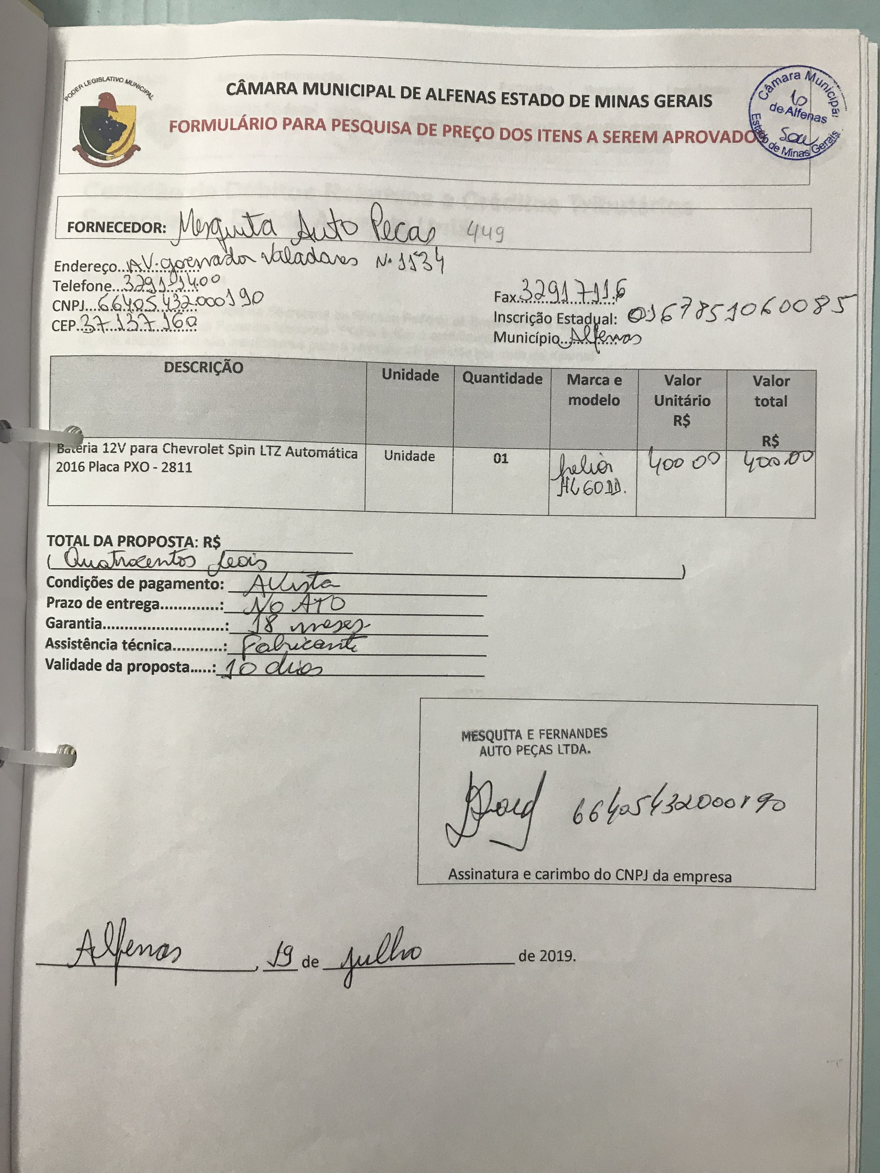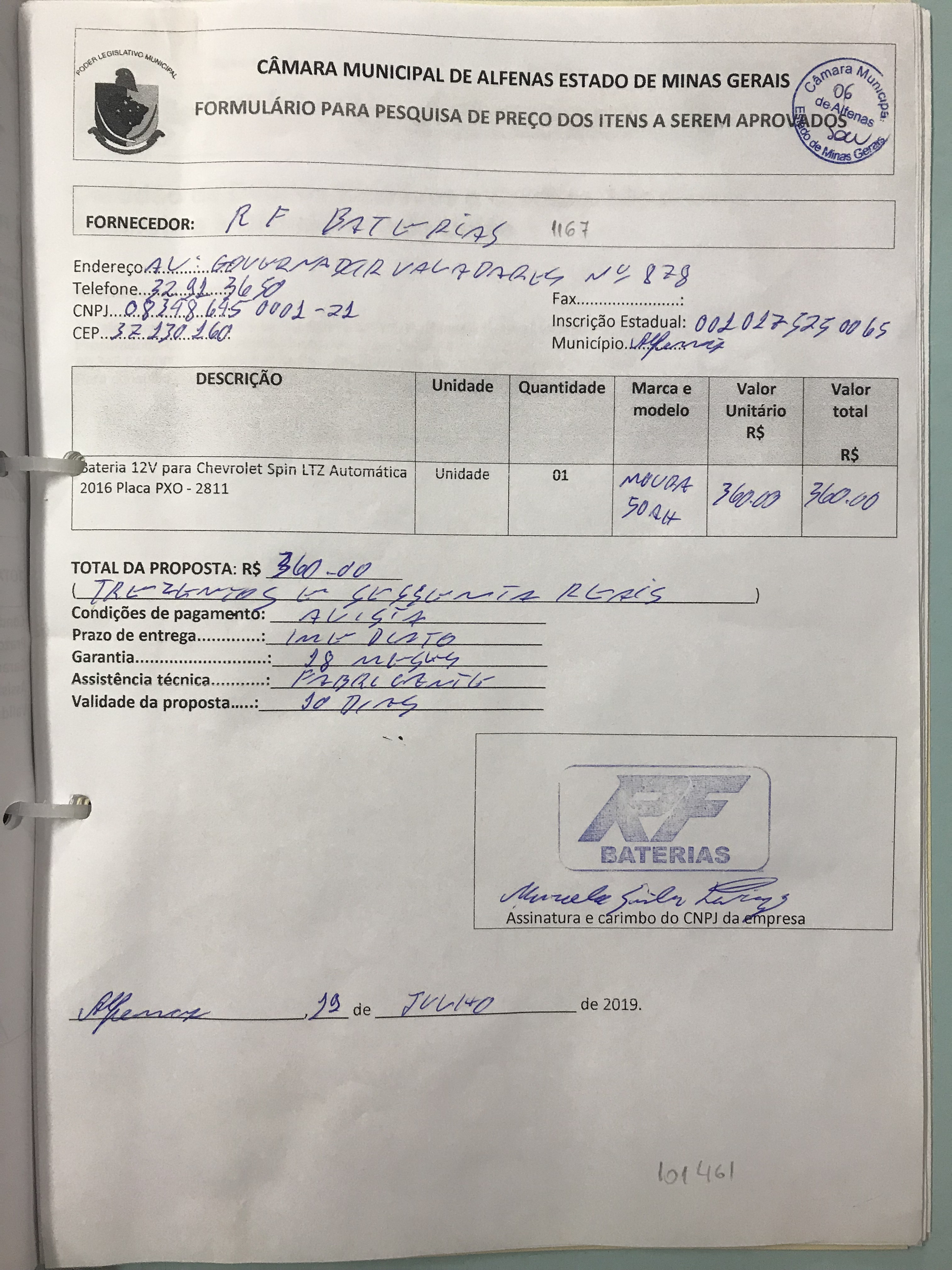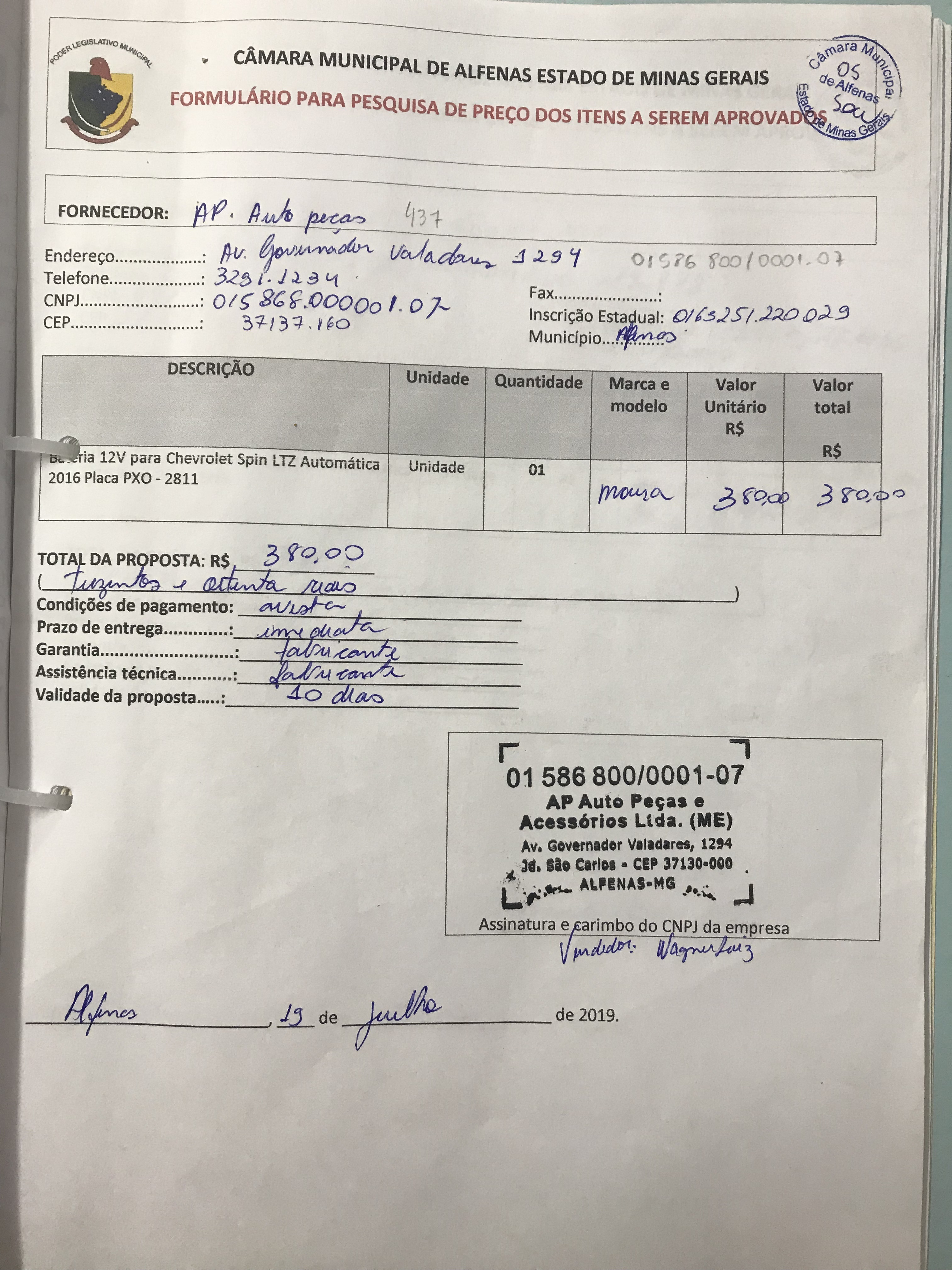 Aquisição de bateria 12 V para Chevrolet Spín Ltz automática placa PXO 2811 de propriedade da Câmara
