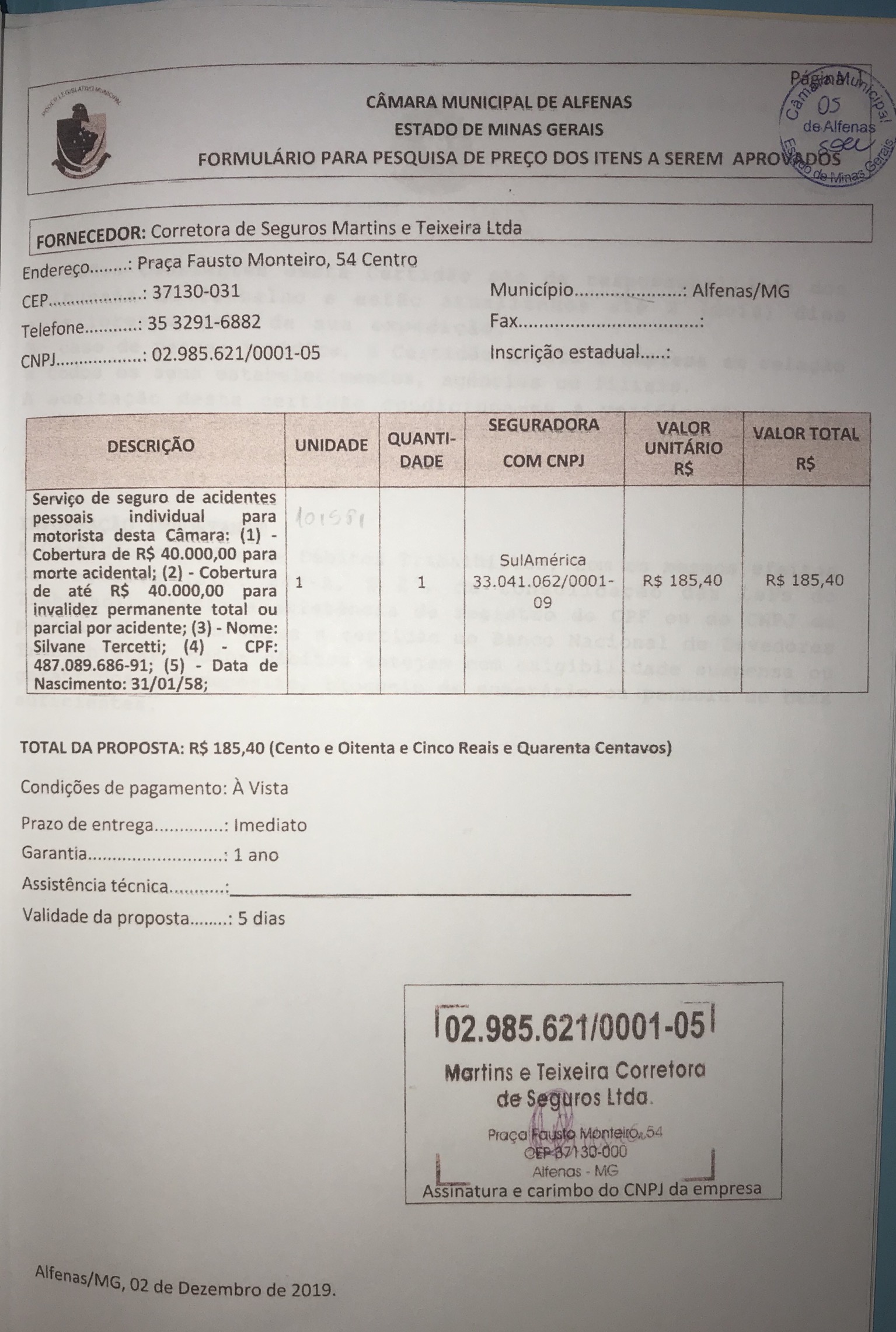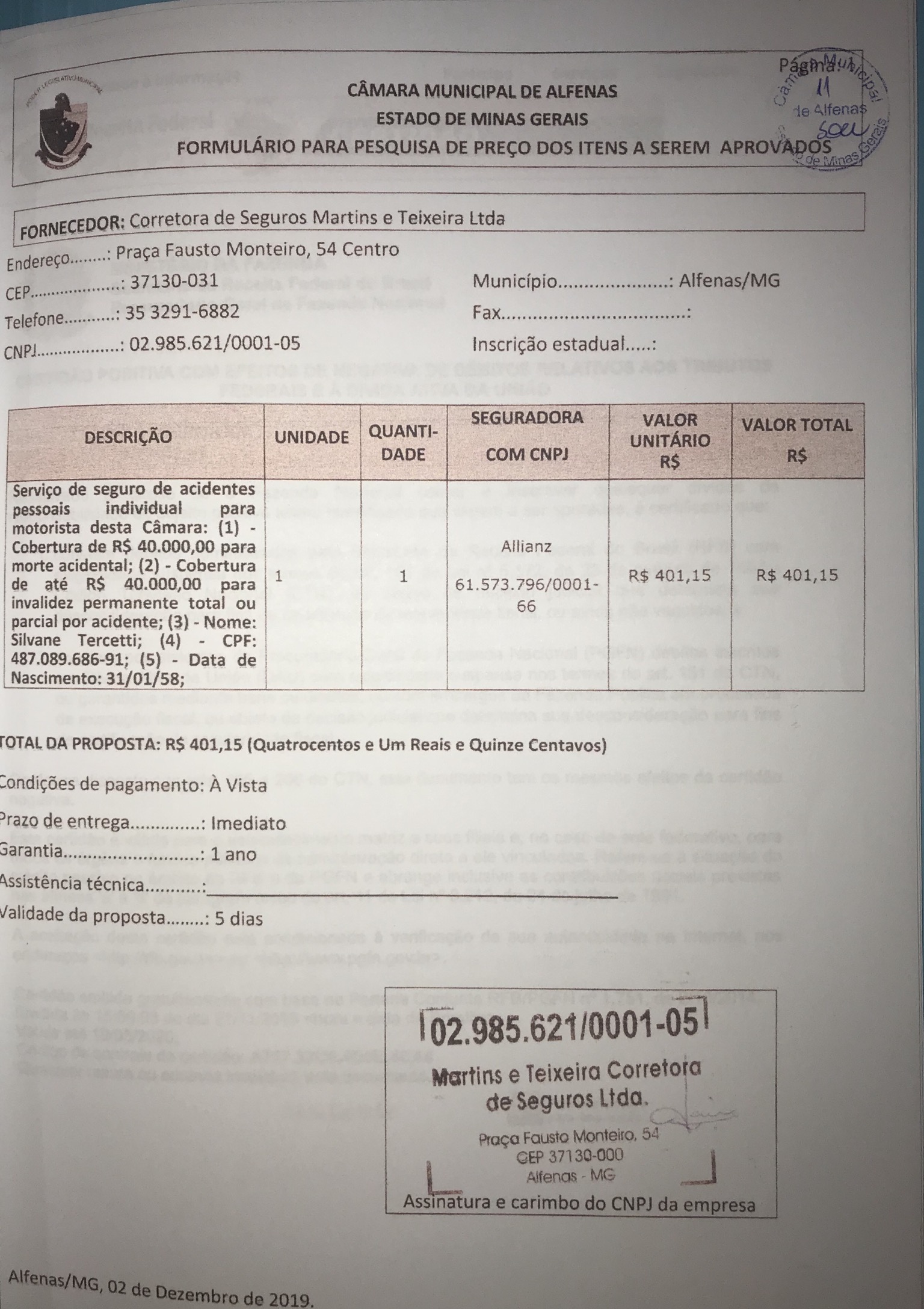 Contratação de seguros de acidentes pessoais para o motorista Silvane Tercetti