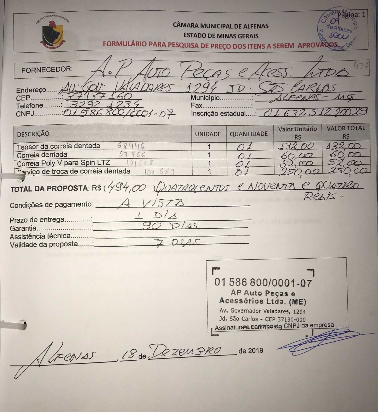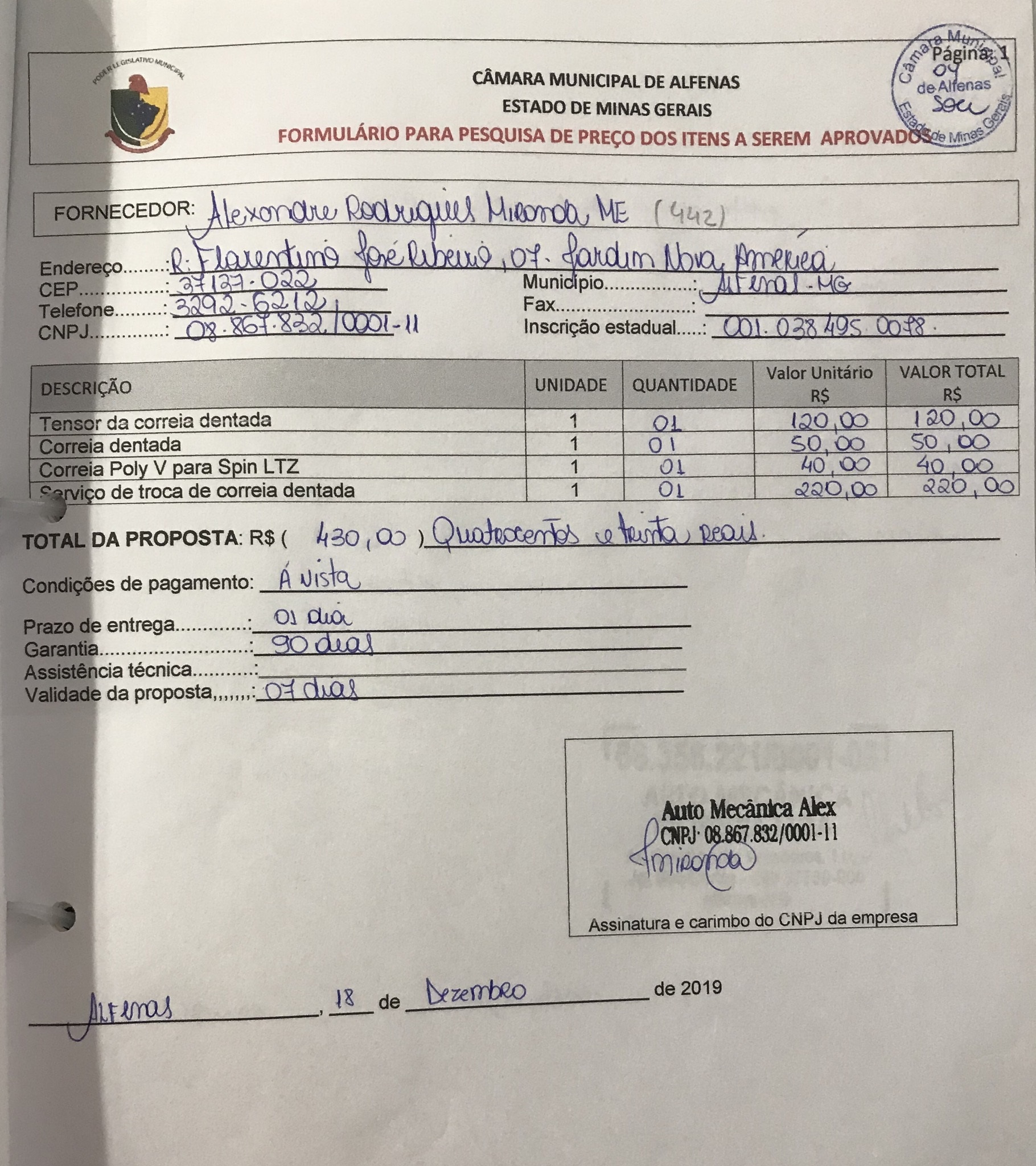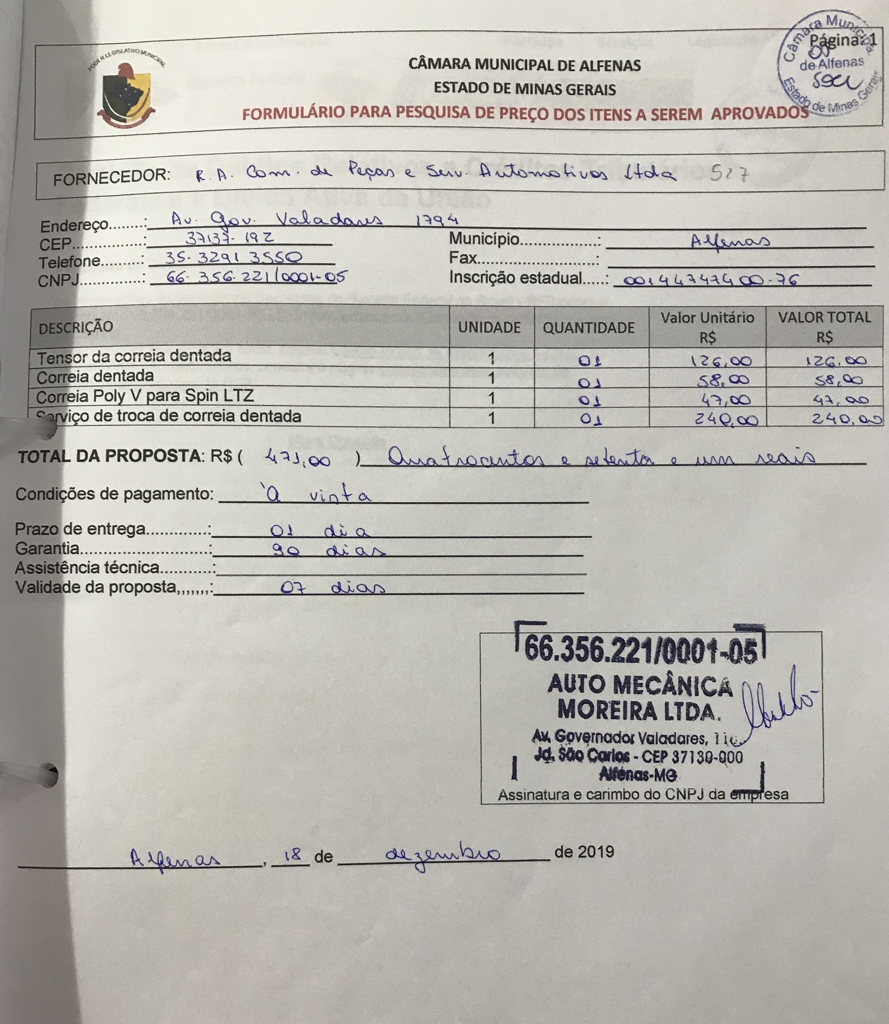 Aquisição e instalação de um tensor da correia dentada, uma correia dentada e uma correia poly V para a Spin da Câmara Municipal