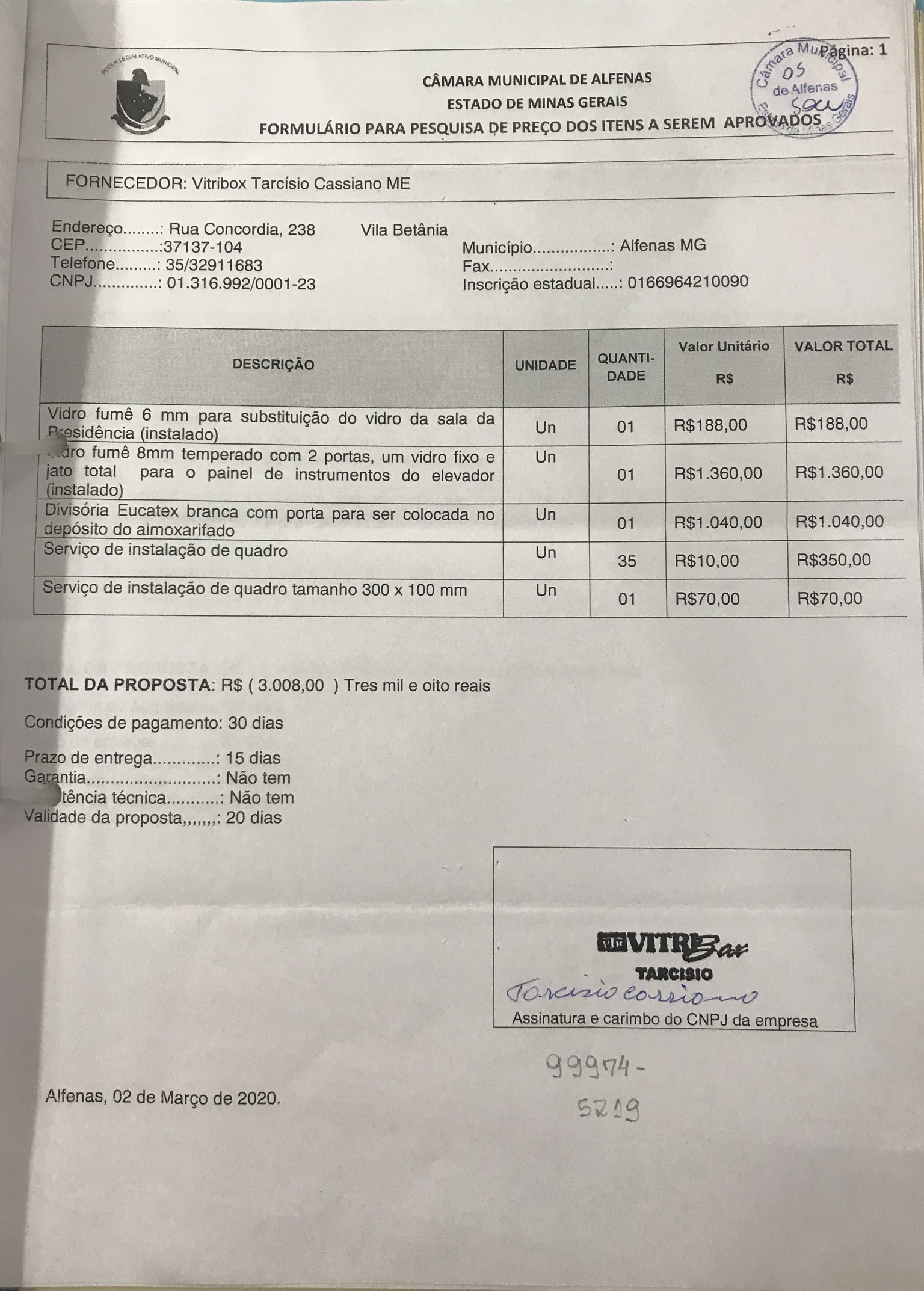 Colocação de vidro na sala da presidência e painel do elevador, divisória no depósito do almoxarifado e instalação de quadros diversos