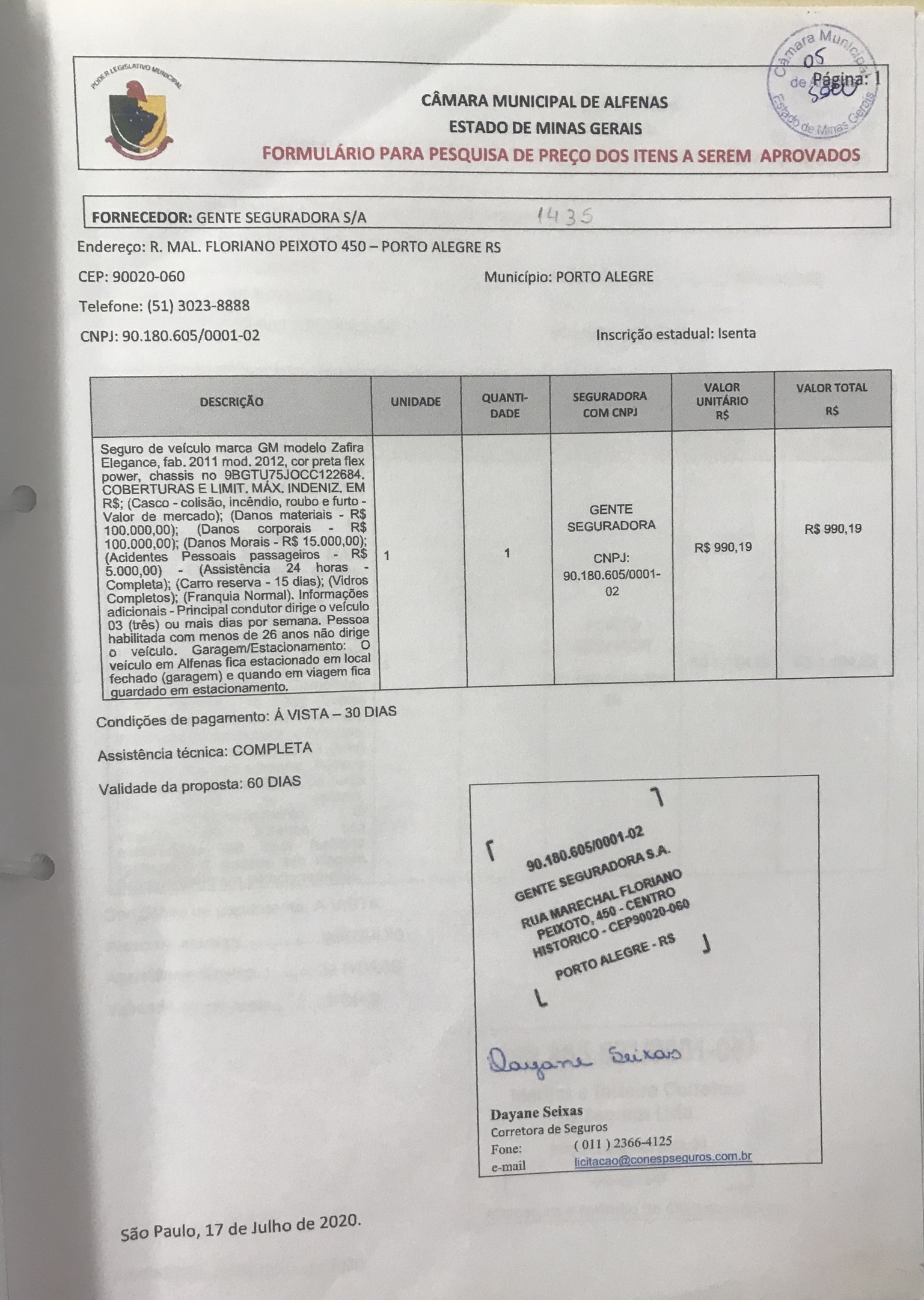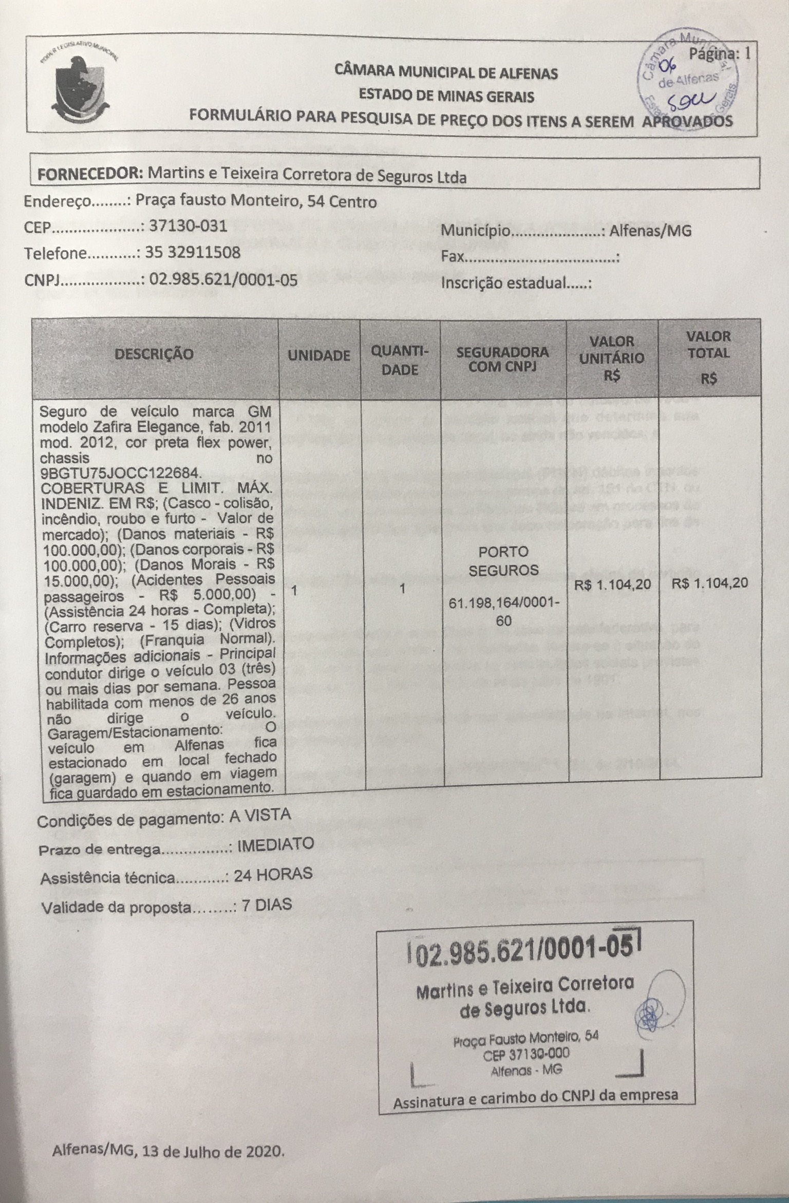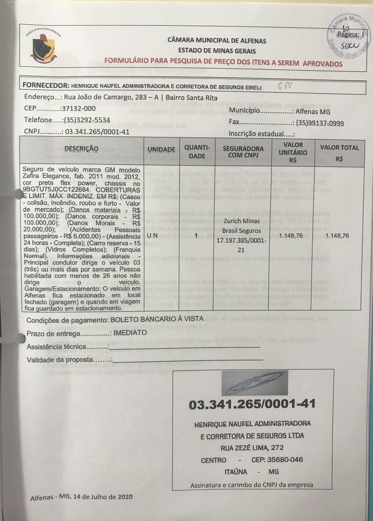 Contratação de seguro para o veículo chevrolet Zafira placa HLF 6686 de propriedade da Câmara Municipal