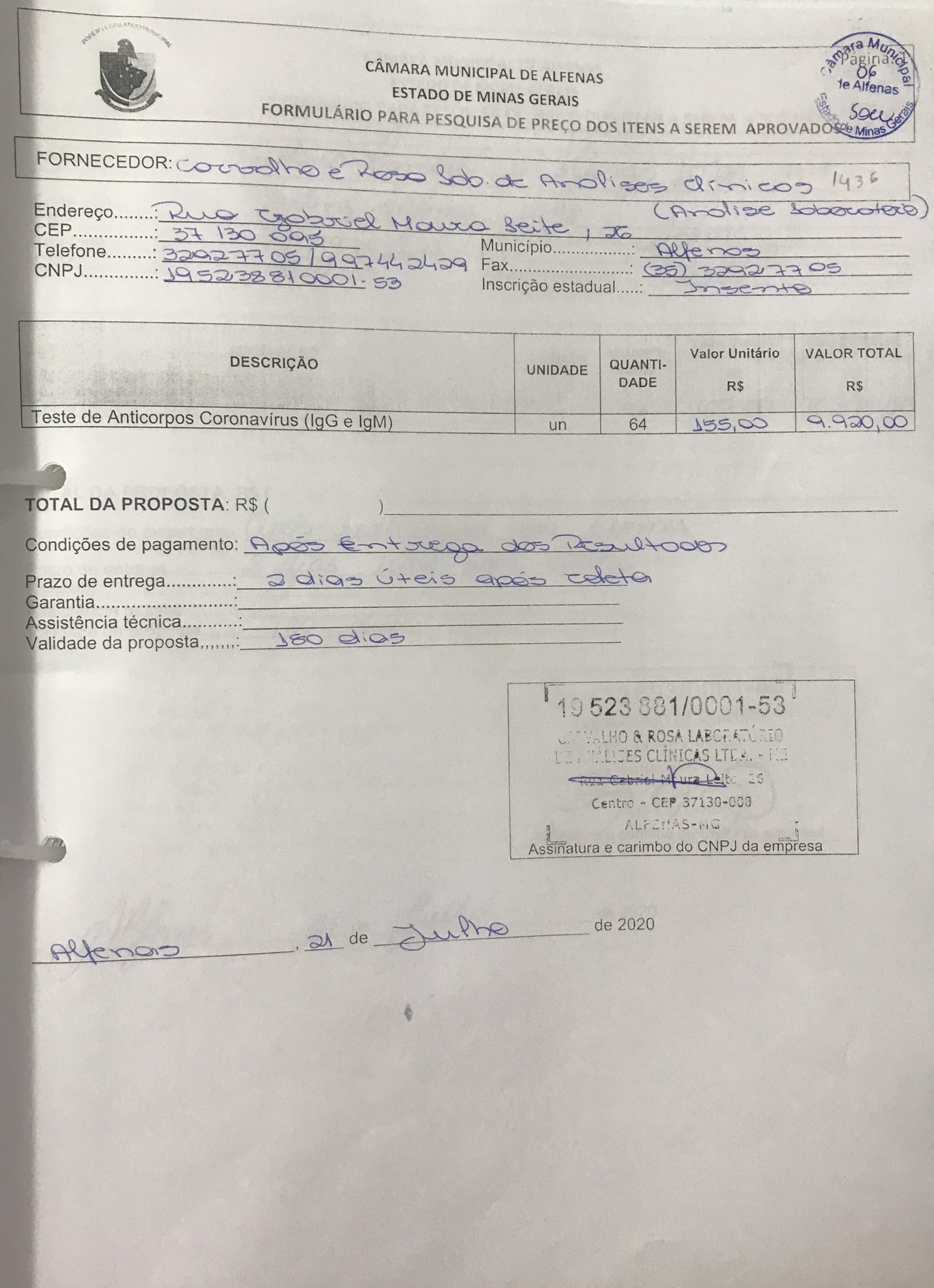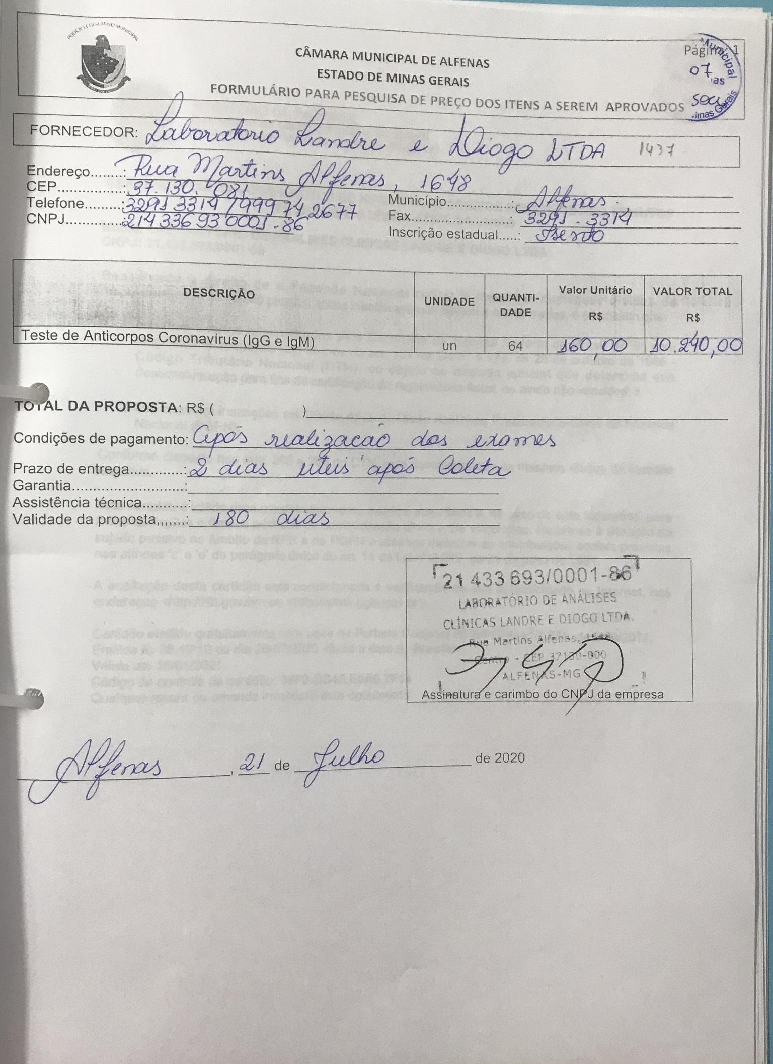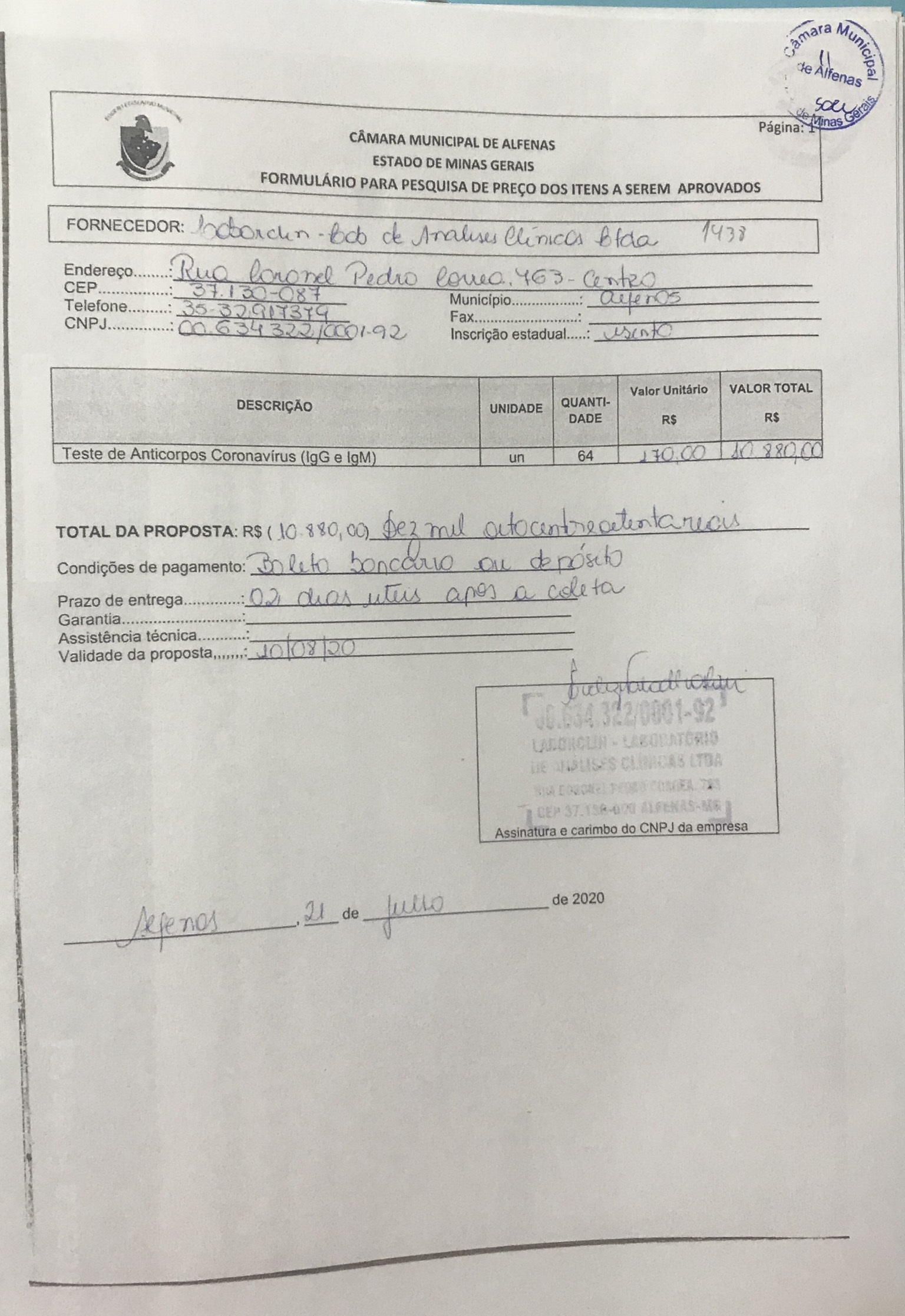 Contratação de laboratório para realização de teste de Covid-19 para até 65 pessoas (vereadores e servidores)