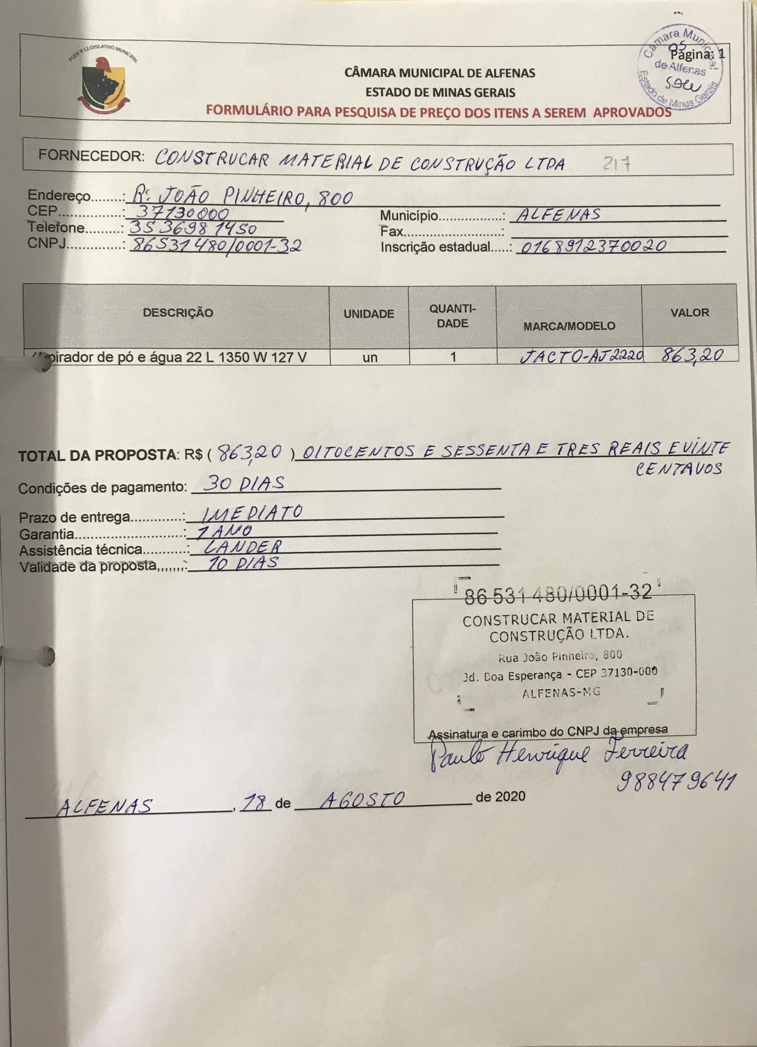 Aquisição de um aspirador de pó e água 22 L 1350 W 127 V para uso na Câmara Municipal