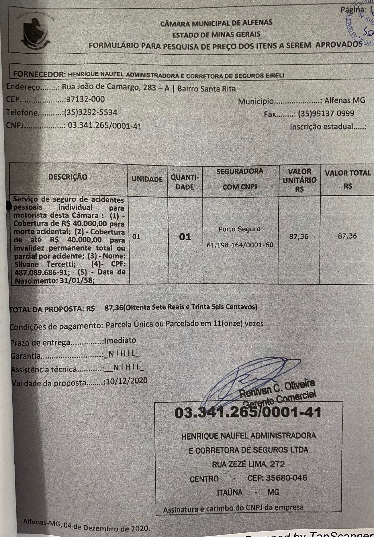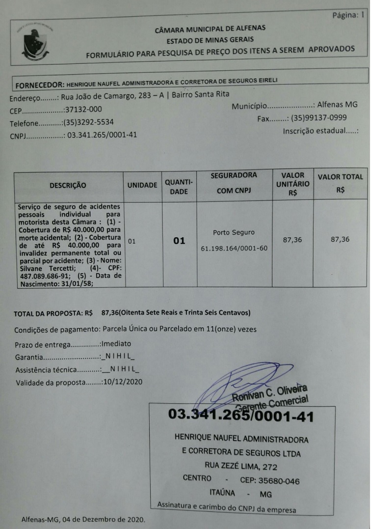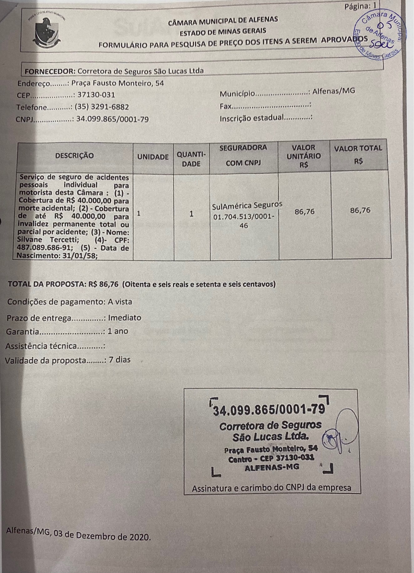 Contratação de seguro de acidentes pessoais para o motorista da Câmara Silvane Tercetti