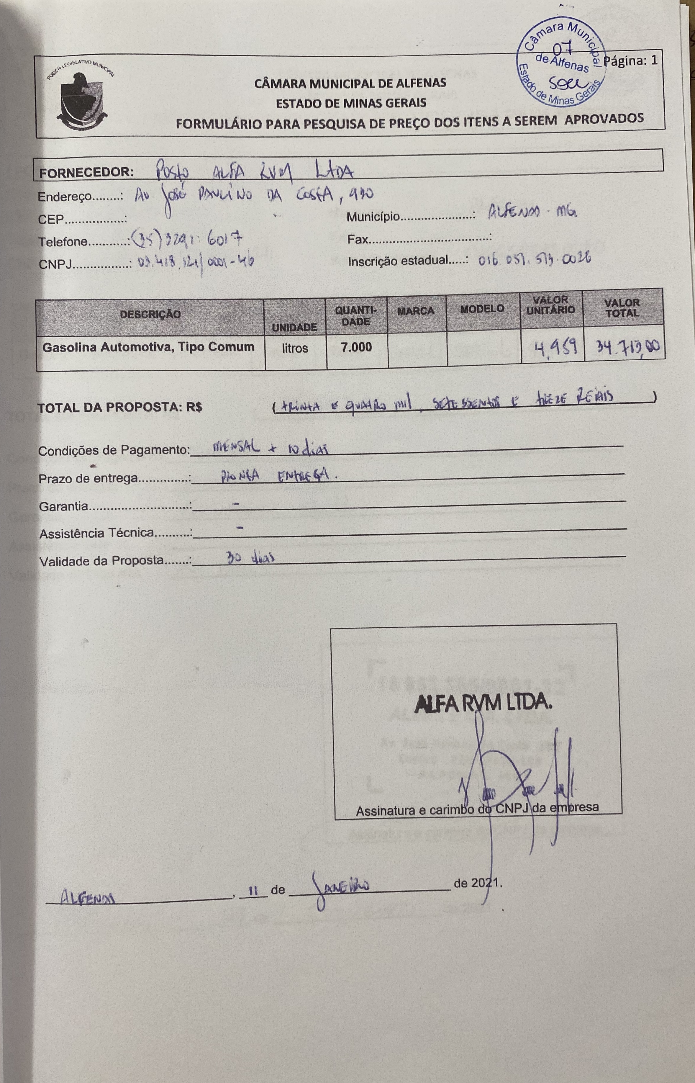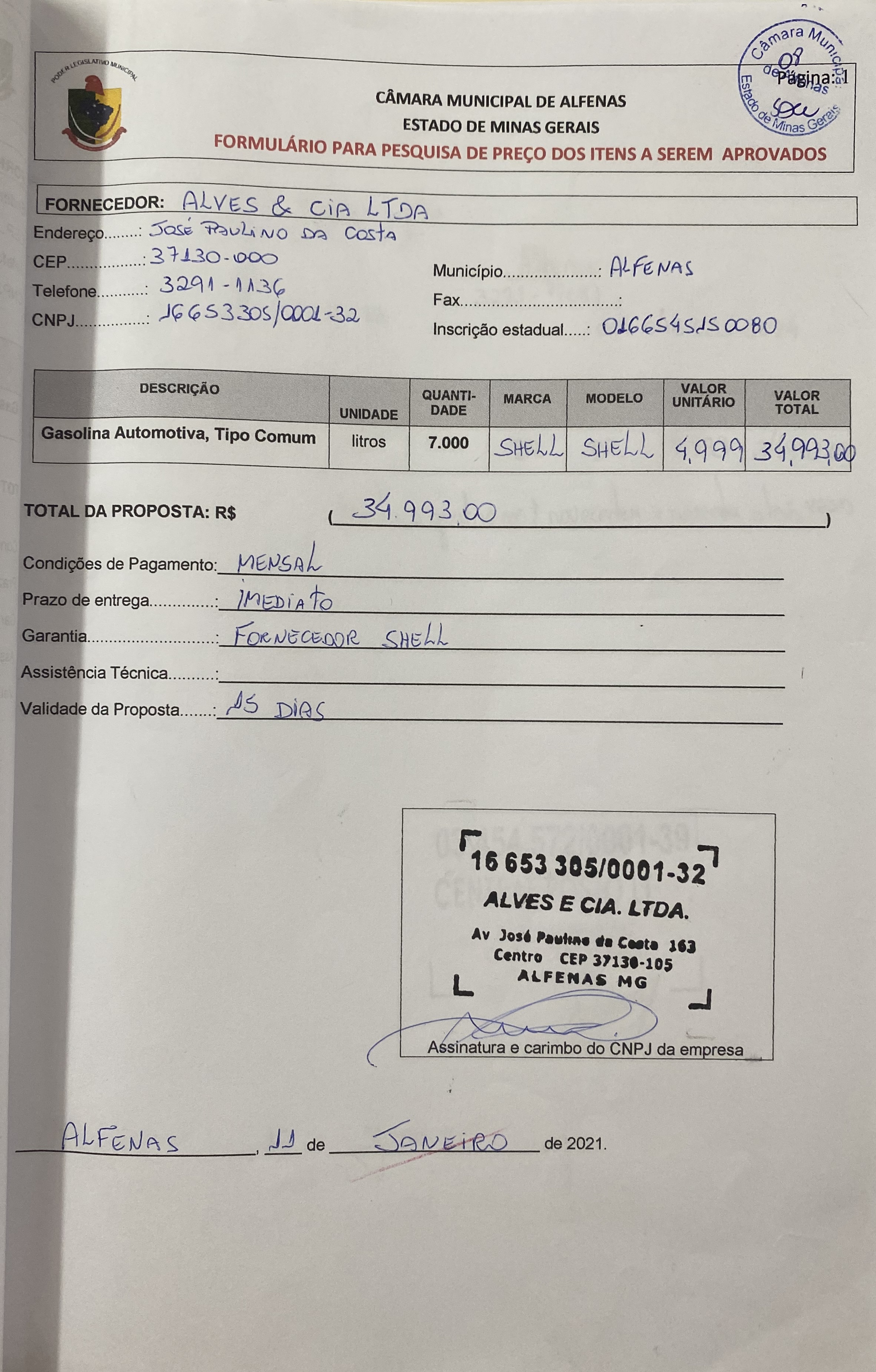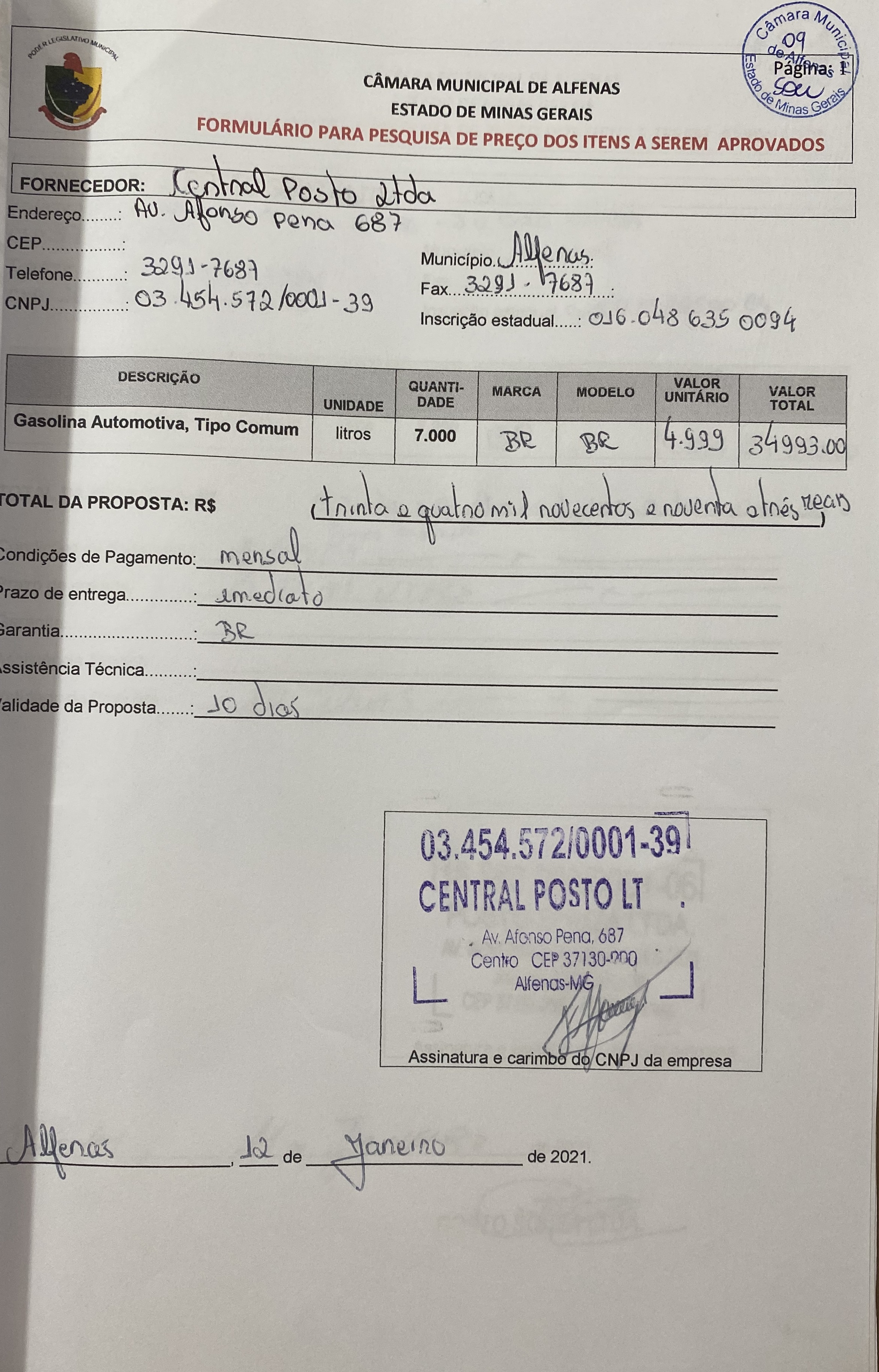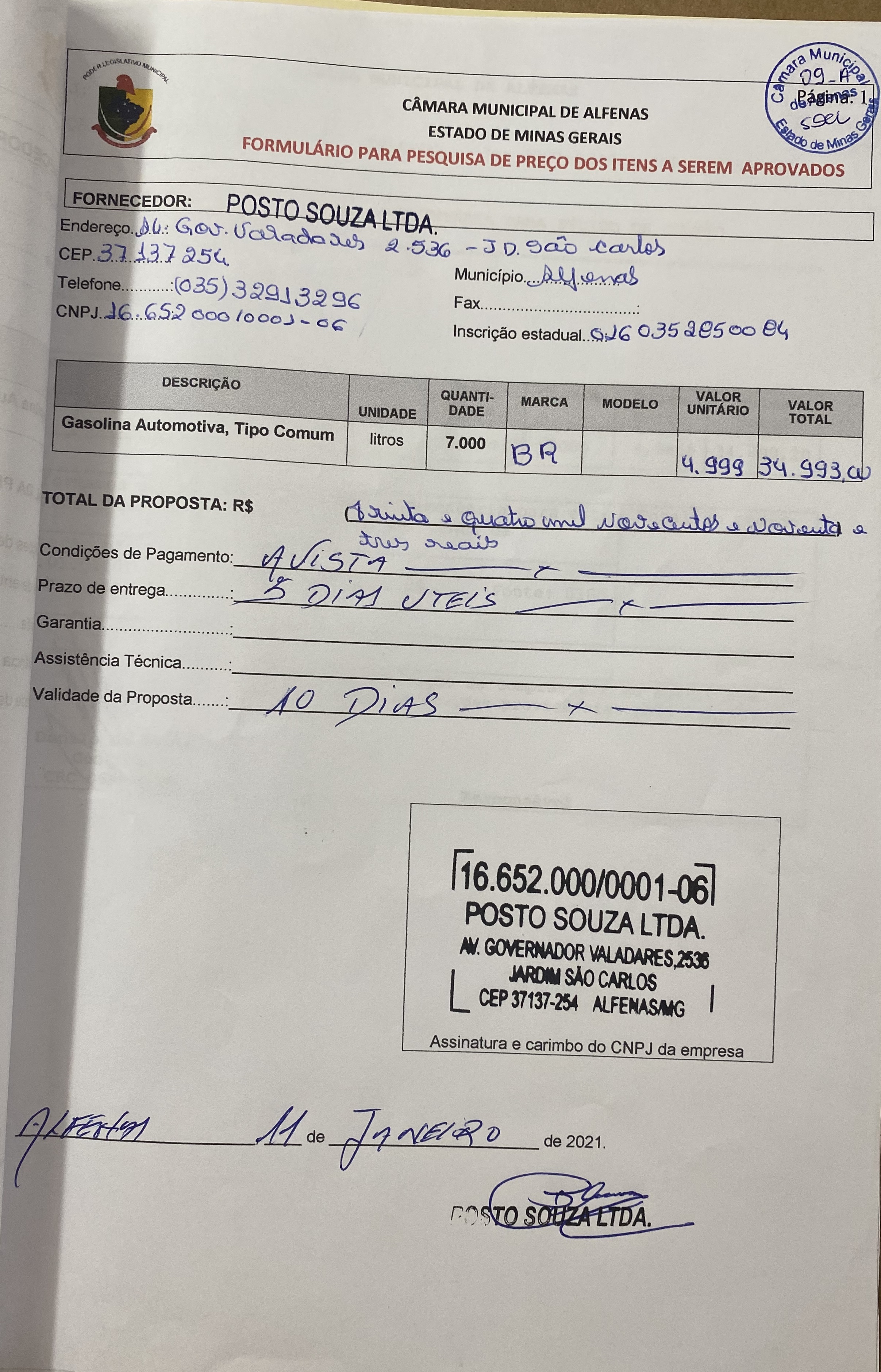 Aquisição de 7000 litros de gasolina automotiva comum para uso nos veículos oficiais da Câmara Municipal no exercício de 2021.