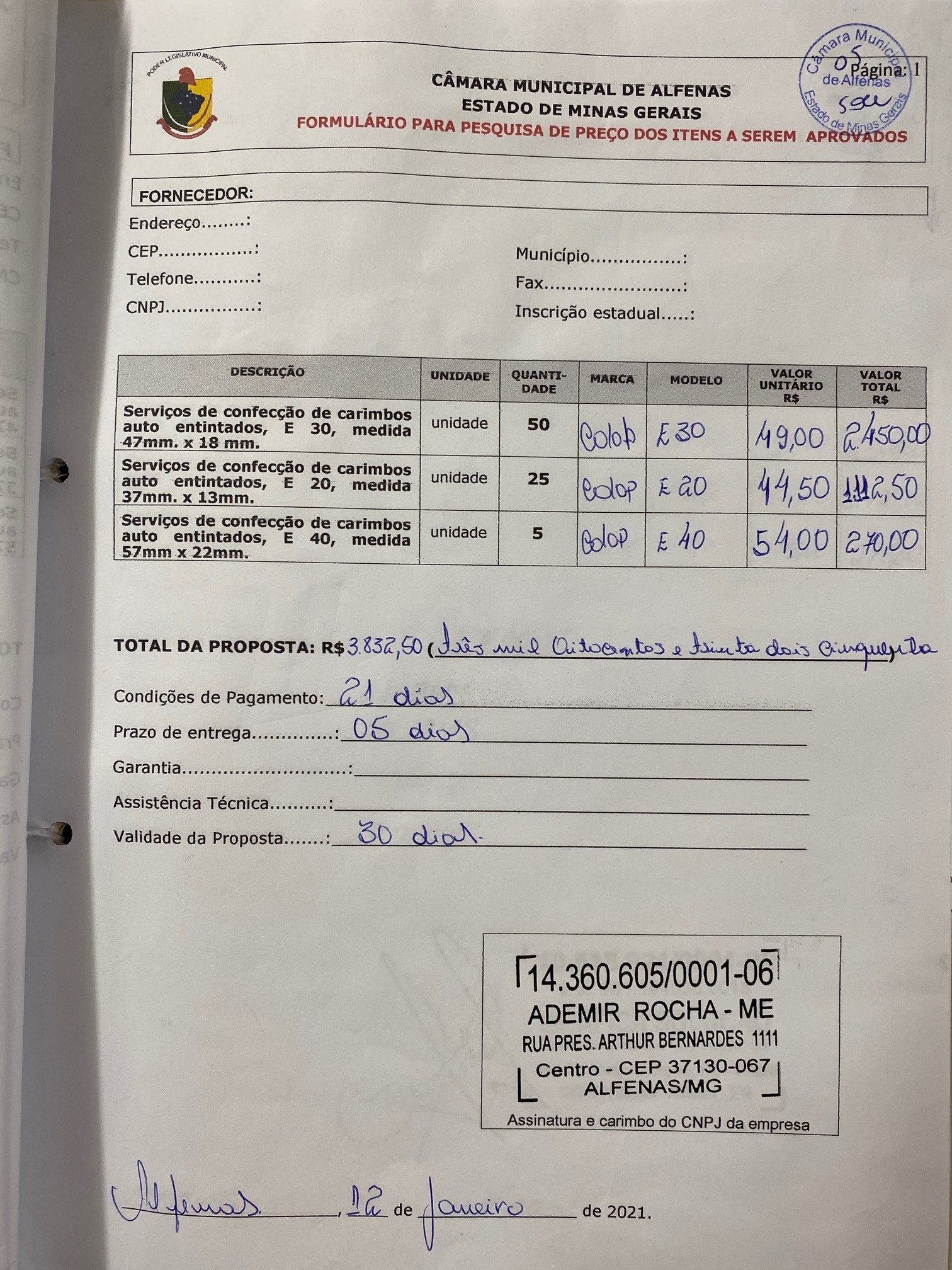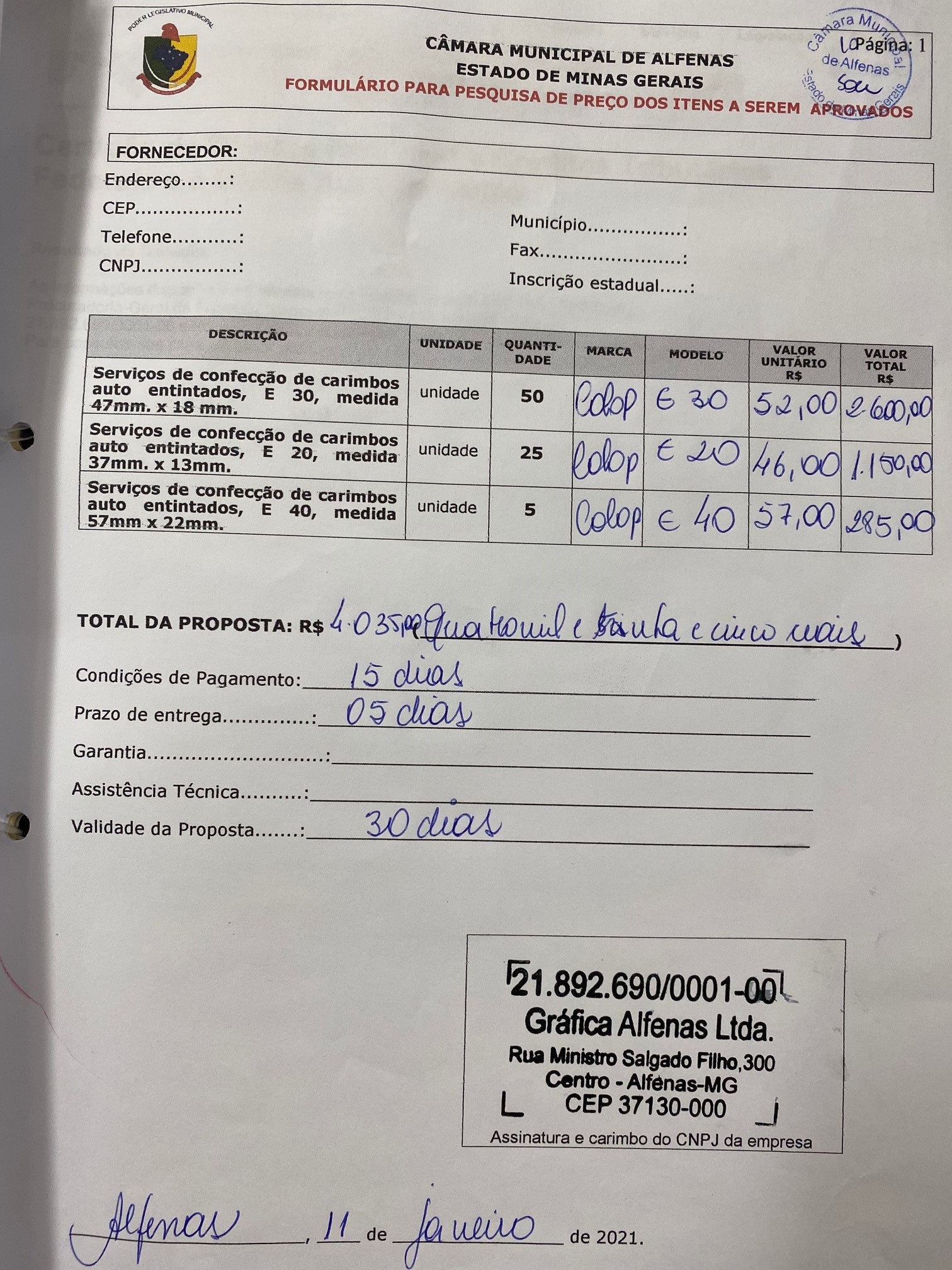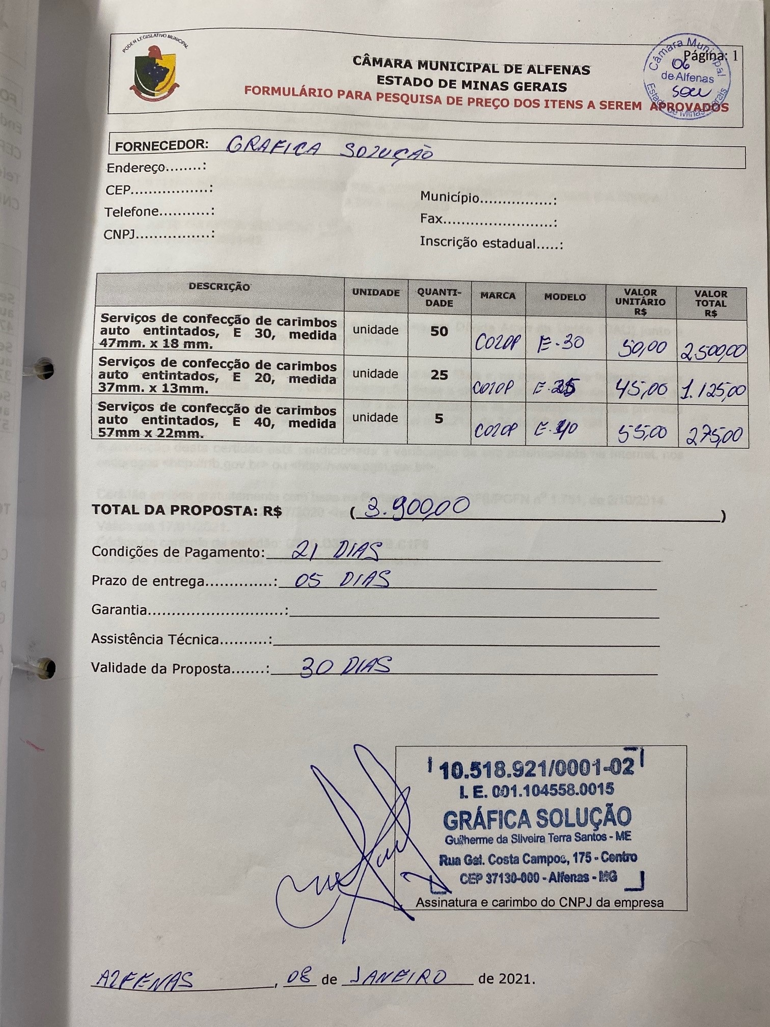 Serviço de confecção de carimbos para uso dos vereadores, assessores e servidores da Câmara Municipal de Alfenas