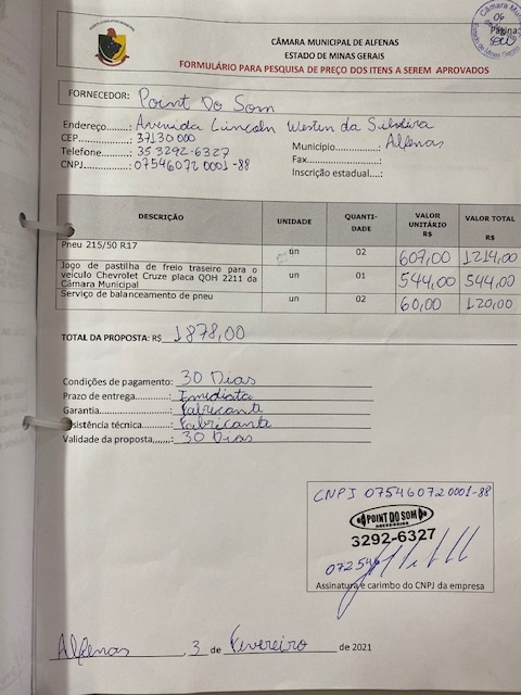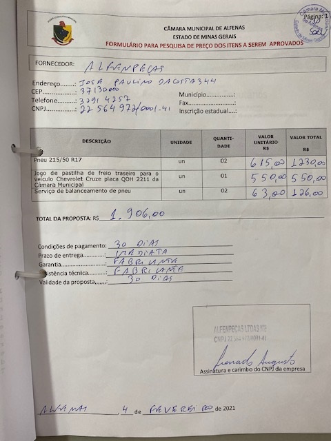 Aquisição de dois pneus 215/50 R17, dois balanceamentos e um jogo de pastilha de freio traseiro para o veículo Cruze da Câmara Municipal