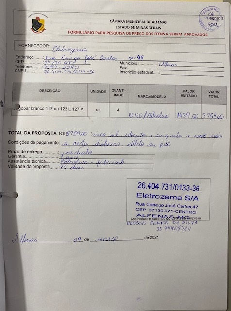 Aquisição de 4 frigobar para colocação em salas da Câmara Municipal