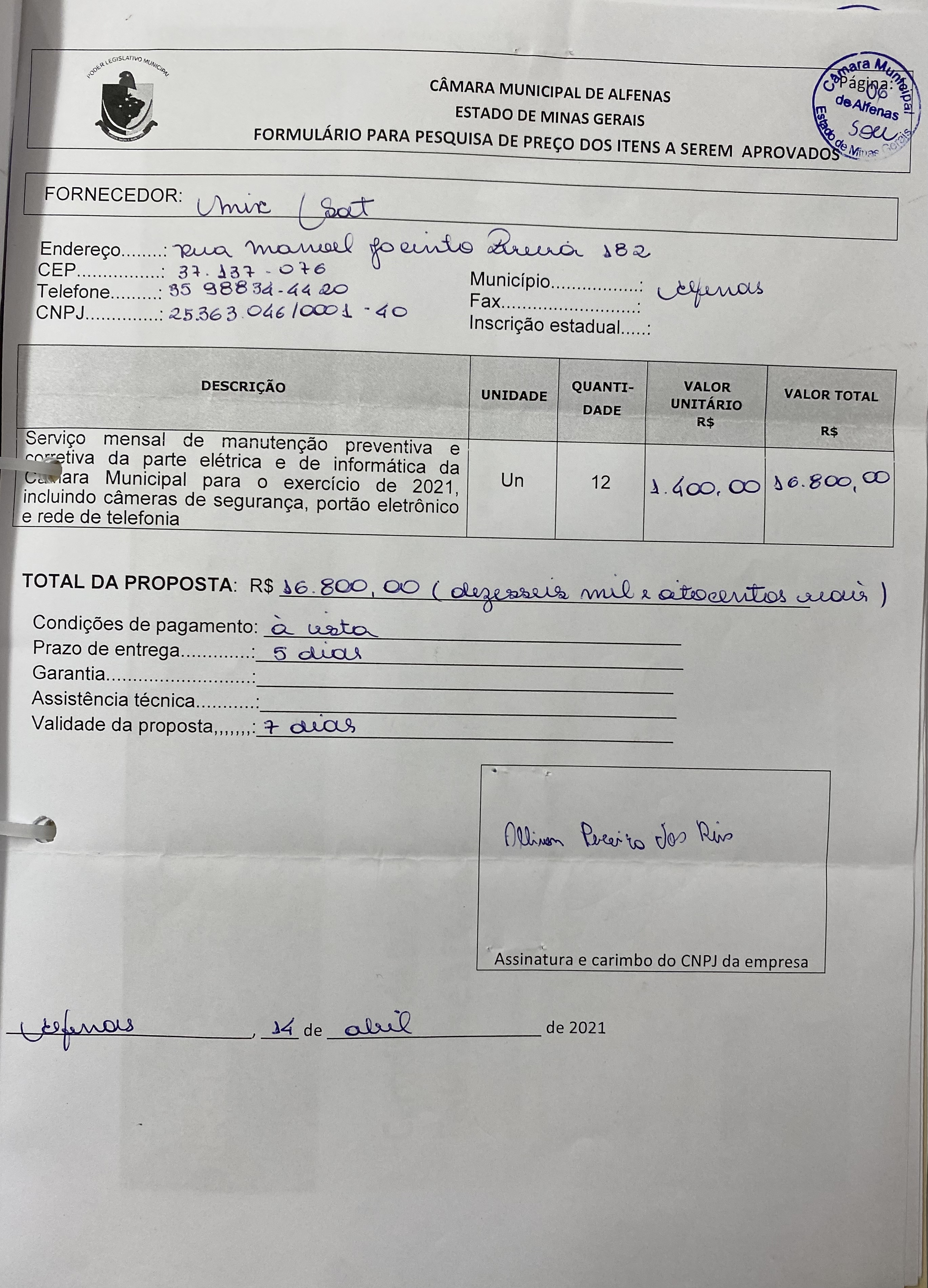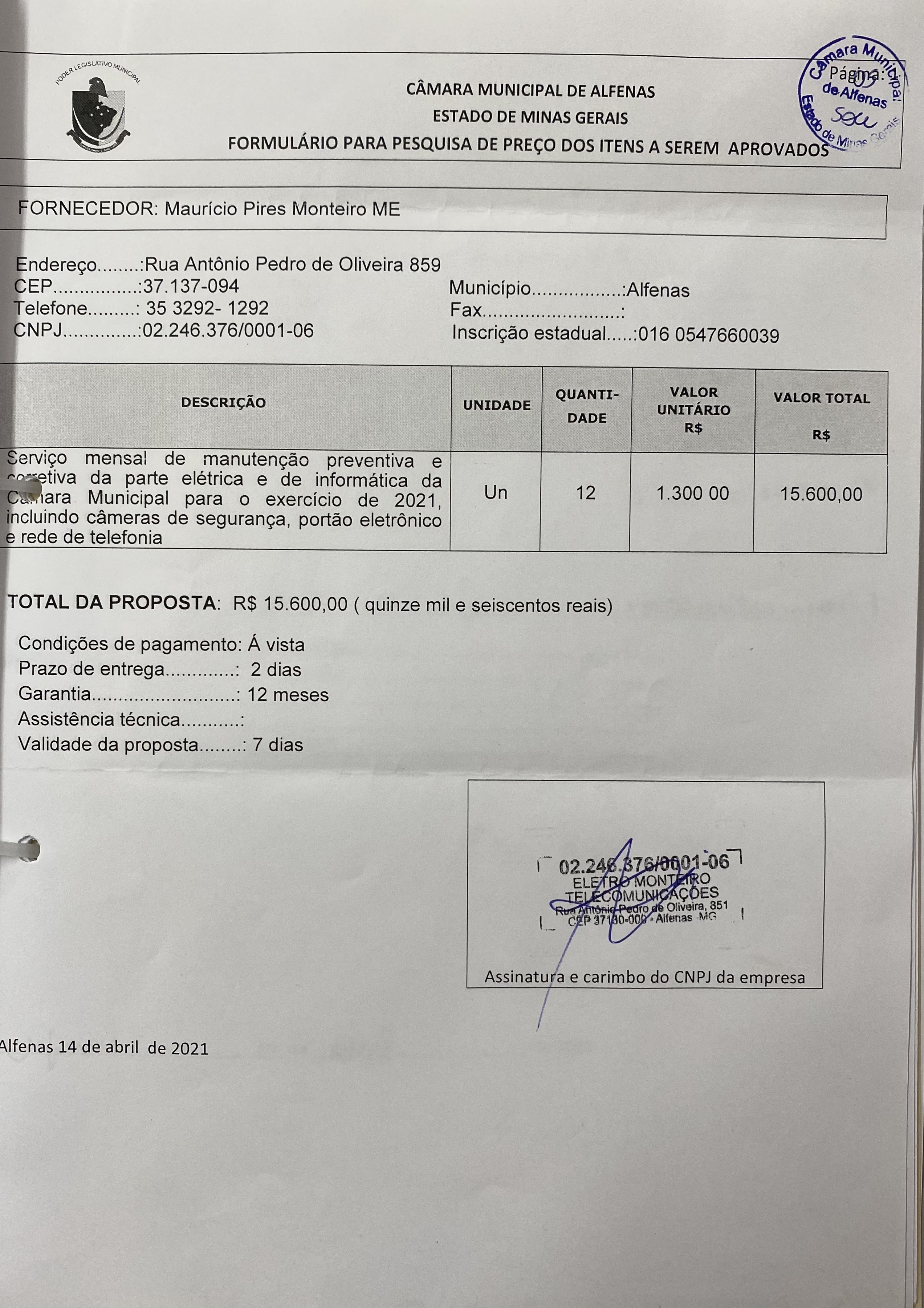 Serviço de manutenção preventiva e corretiva da parte elétrica e de informática da Câmara Municipal, incluindo câmeras de segurança, portão eletrônico e rede de telefonia
