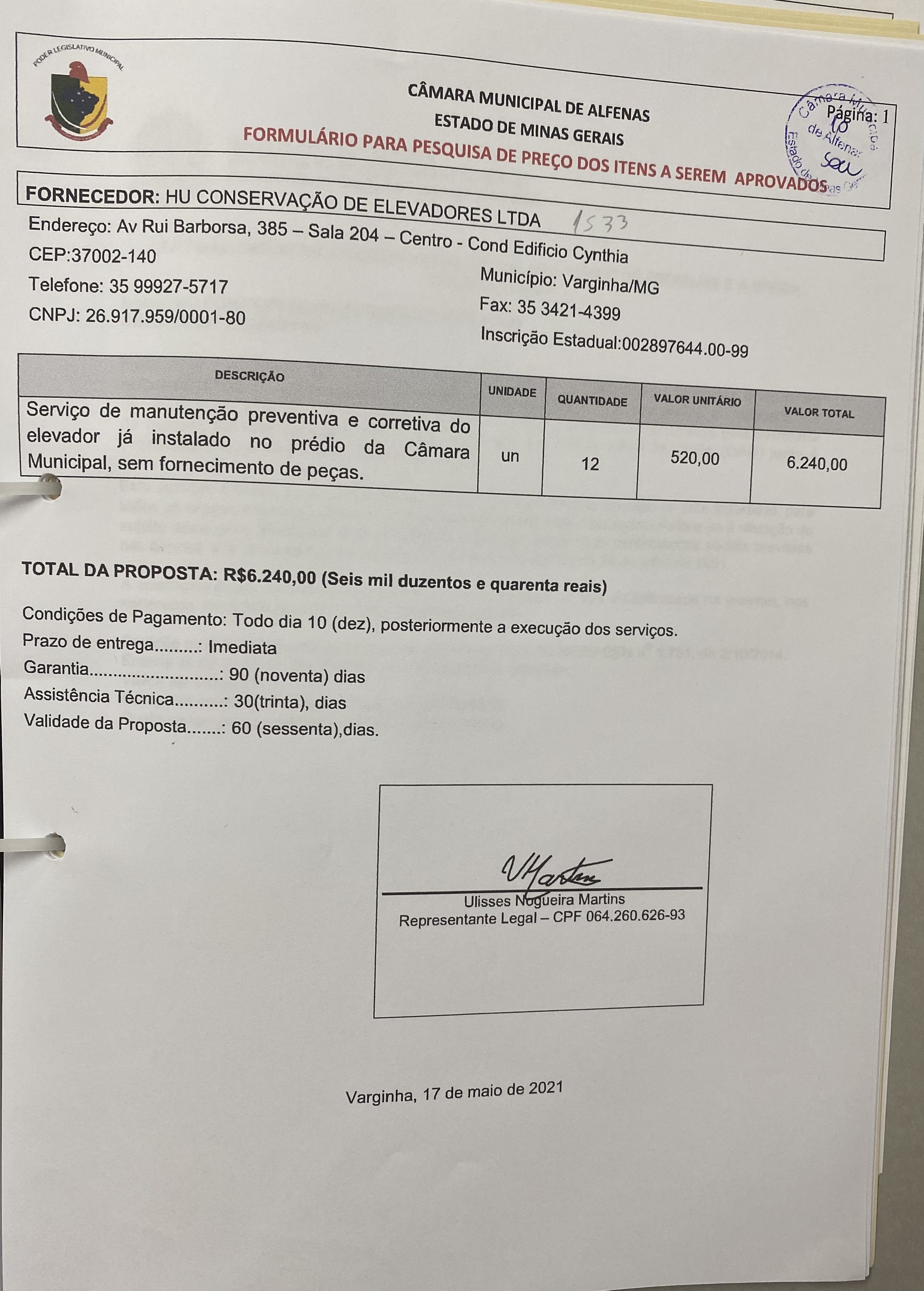 Serviço mensal de manutenção preventiva e corretiva do elevador já instalado na Câmara Municipal, sem fornecimento de peças