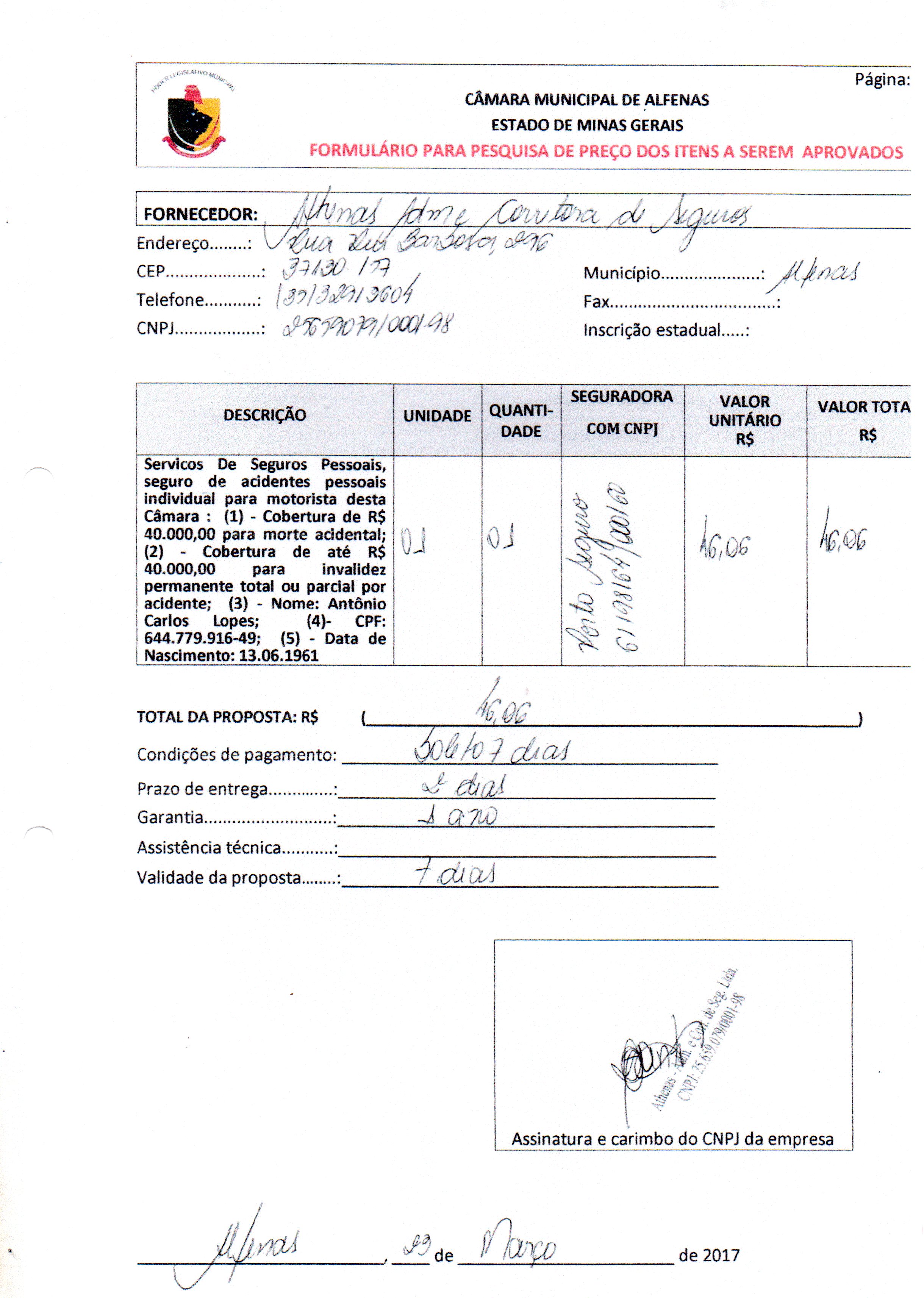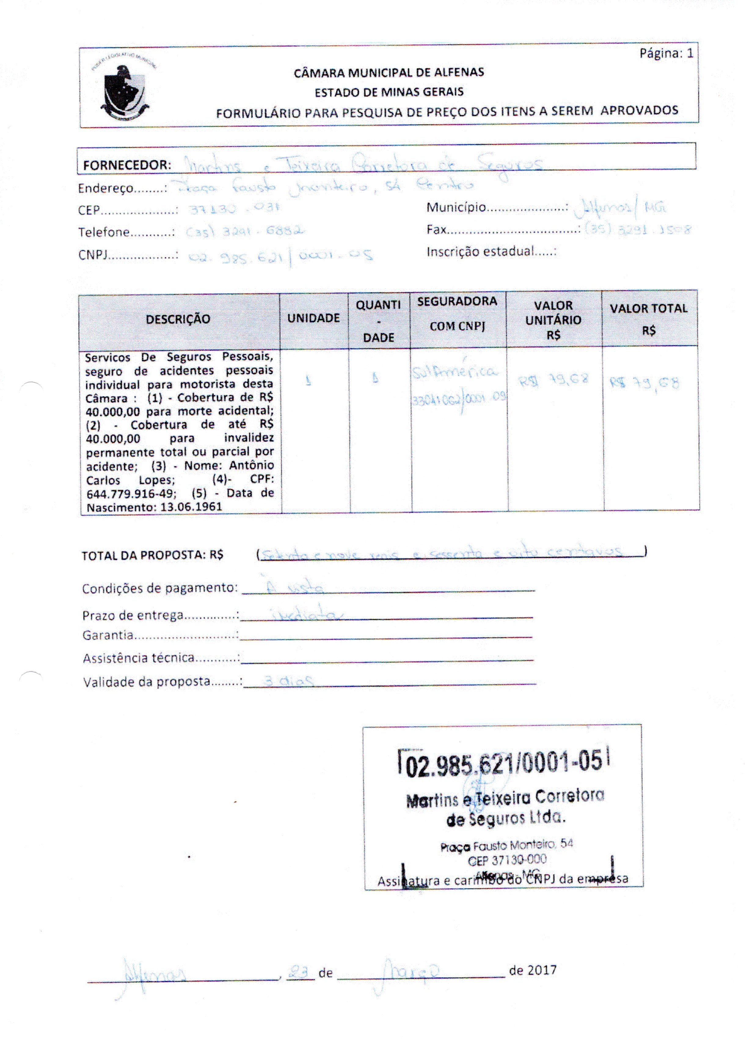 Seguro de acidentes pessoais individual para motorista desta Câmara : (1) - Cobertura de R$ 40.000,00 para morte acidental; (2) - Cobertura de até R$ 40.000,00 para invalidez permanente total ou parcial por acidente; (3) - Nome: Antônio Carlos Lopes; (4)- CPF: 644.779.916-49; (5) - Data de Nascimento: 13.06.1961