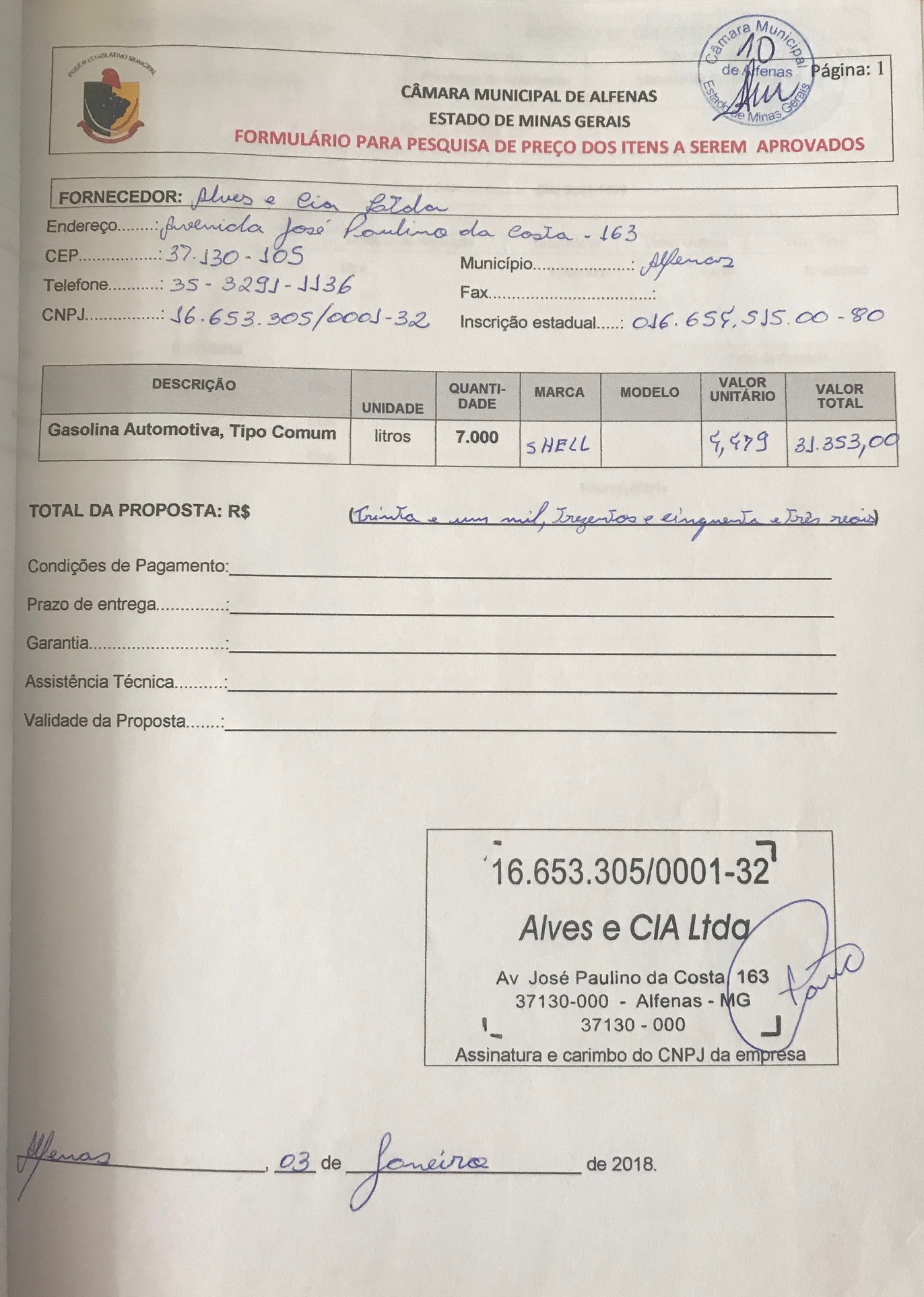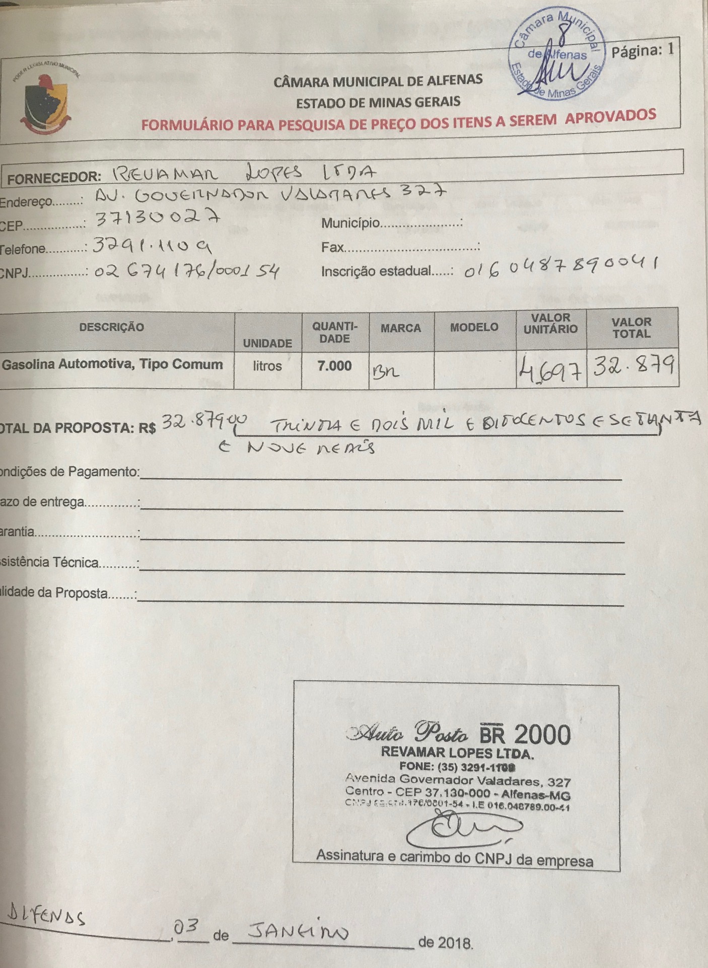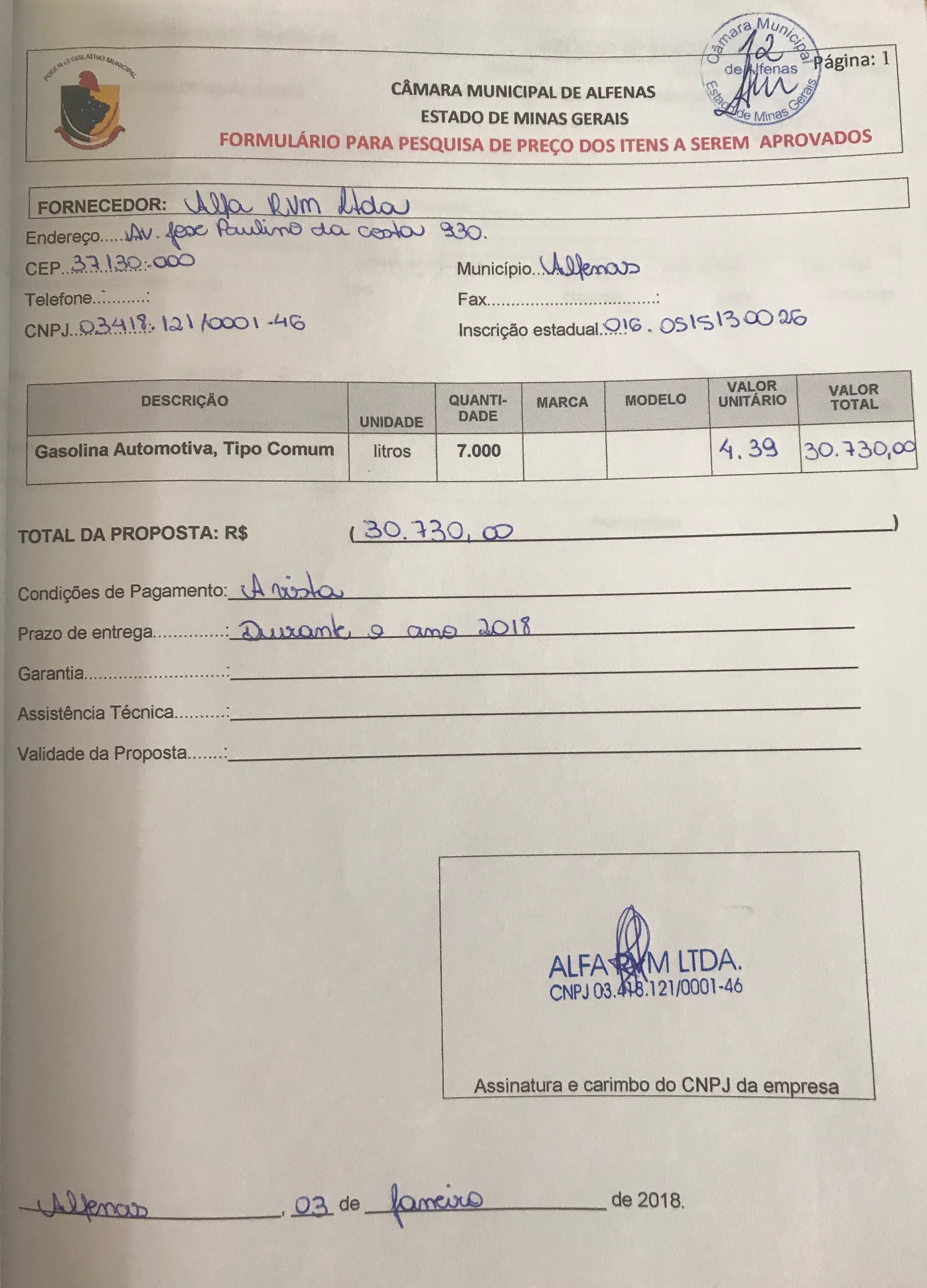 Aquisição de gasolina automotiva, tipo comum, para abastecimento da frota desta Câmara Municipal, exercício de 2018