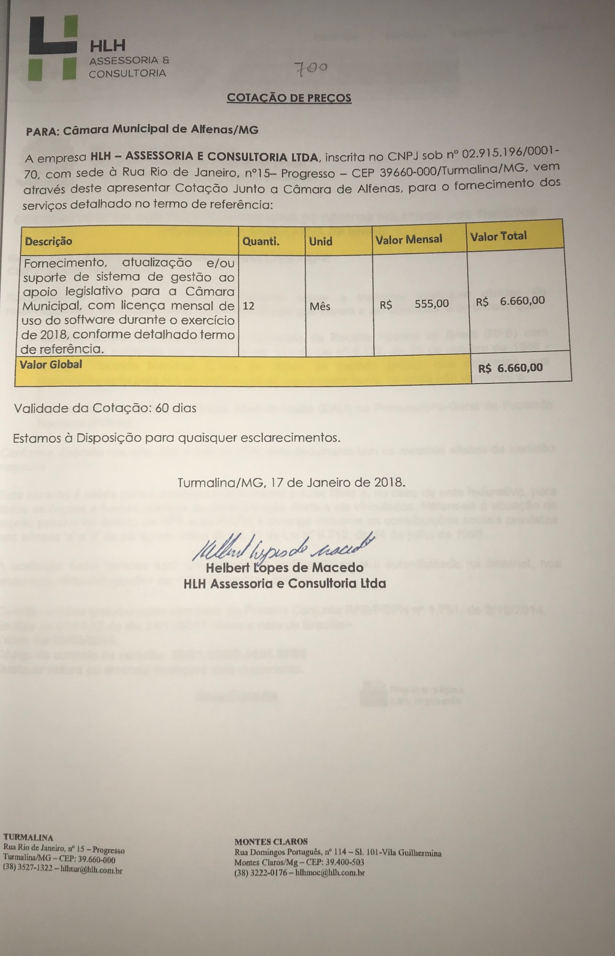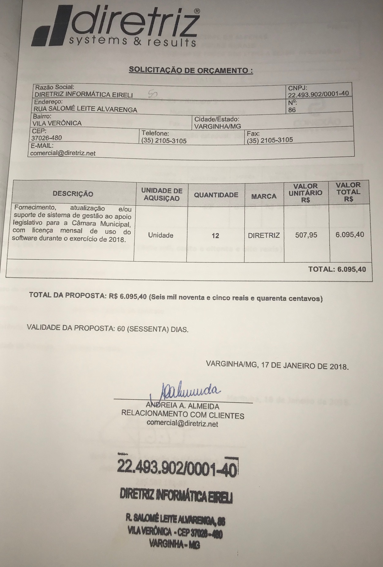 Fornecimento, atualização e/ou suporte de sistema de gestão ao apoio legislativo para Câmara Municipal com licença mensal de uso do software durante o exercício de 2018.