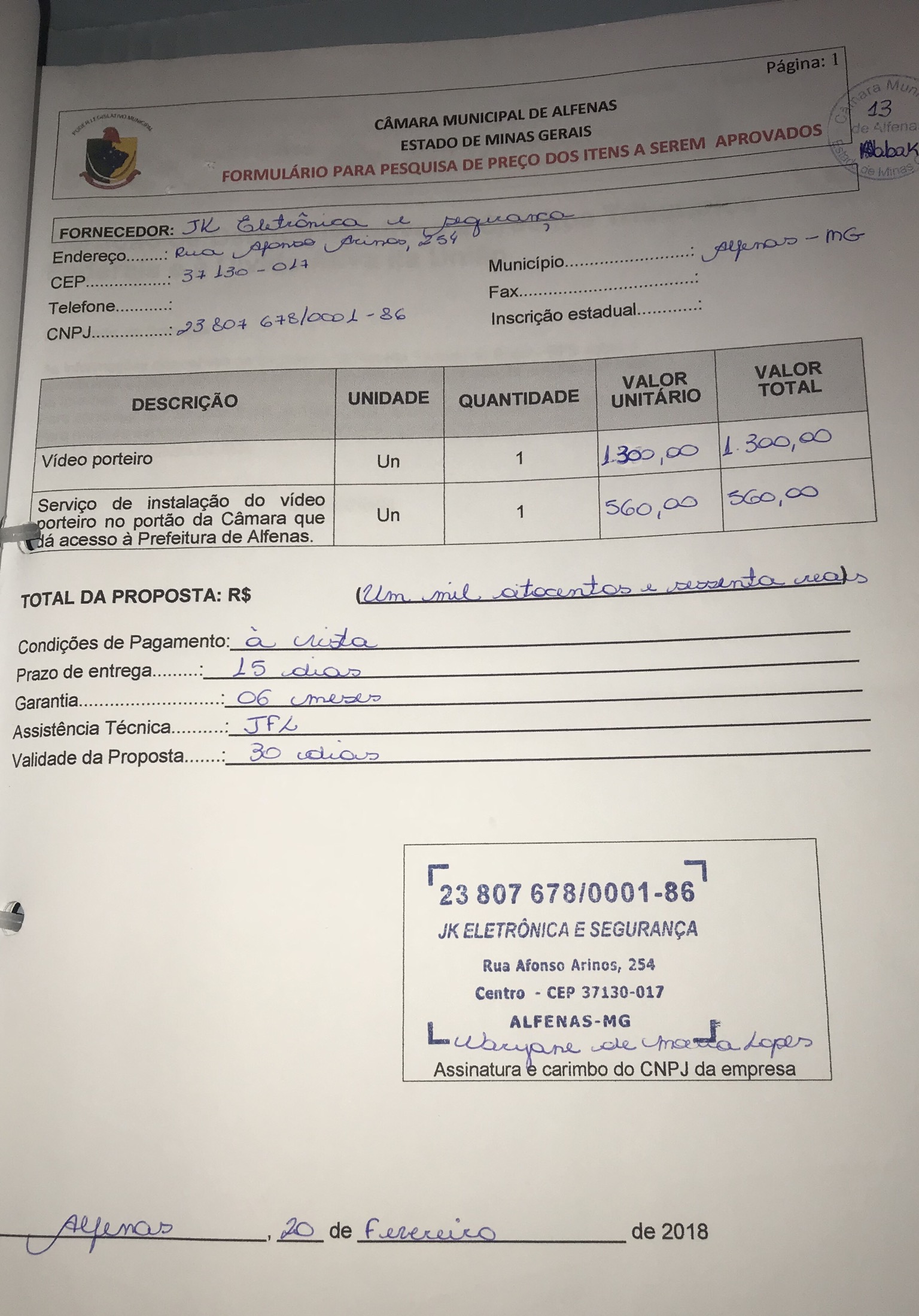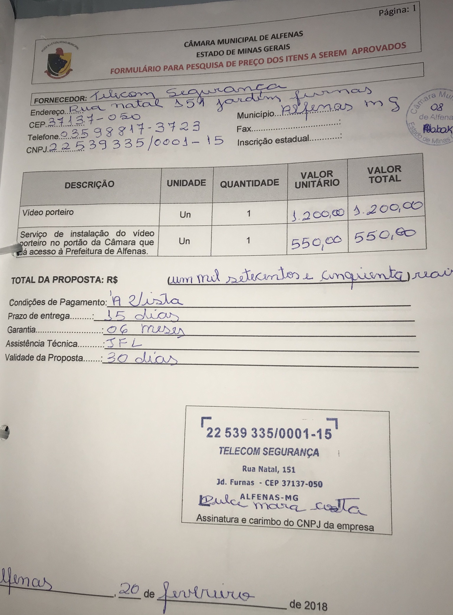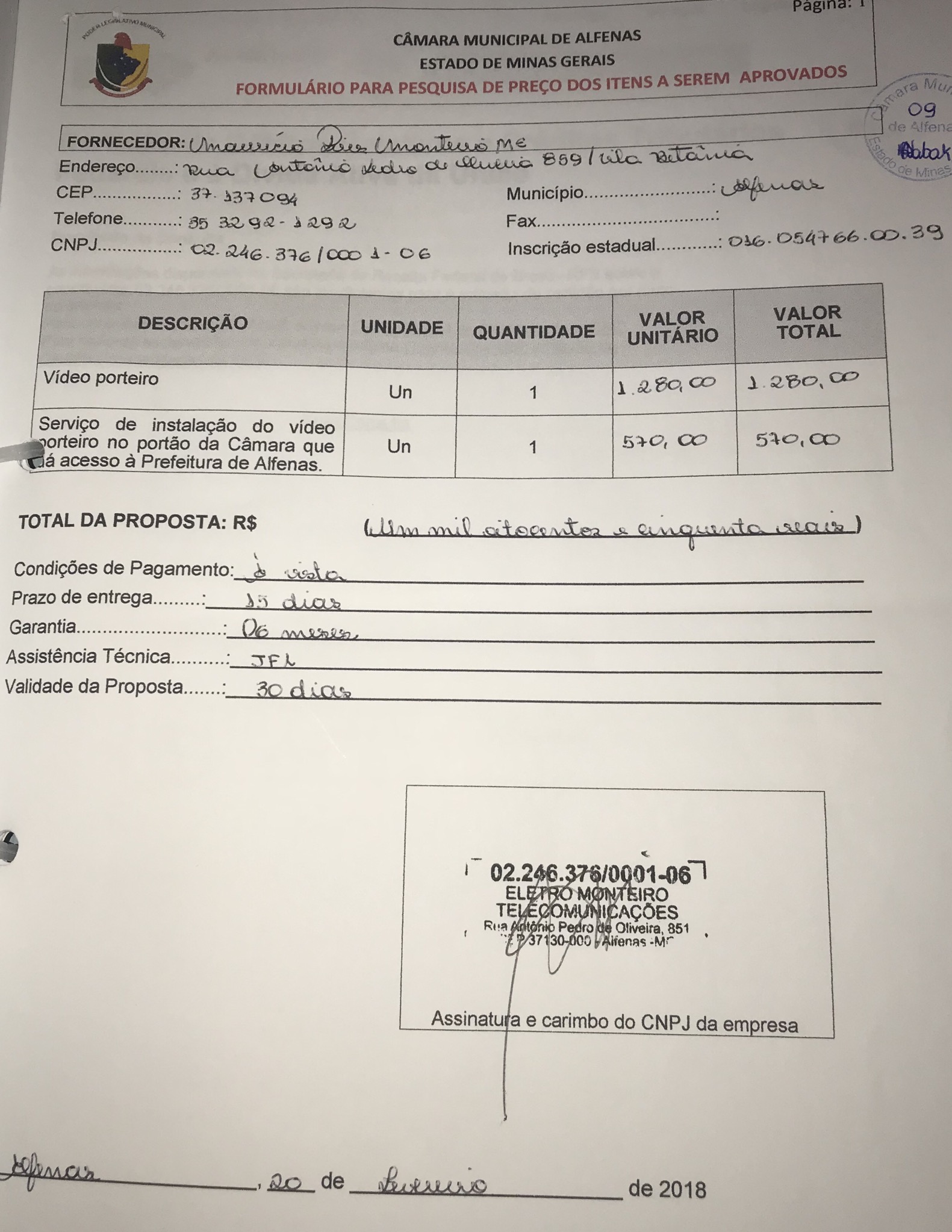 Aquisição e instalação de um vídeo porteiro para ser instalado no portão da Câmara que dá acesso à Prefeitura
