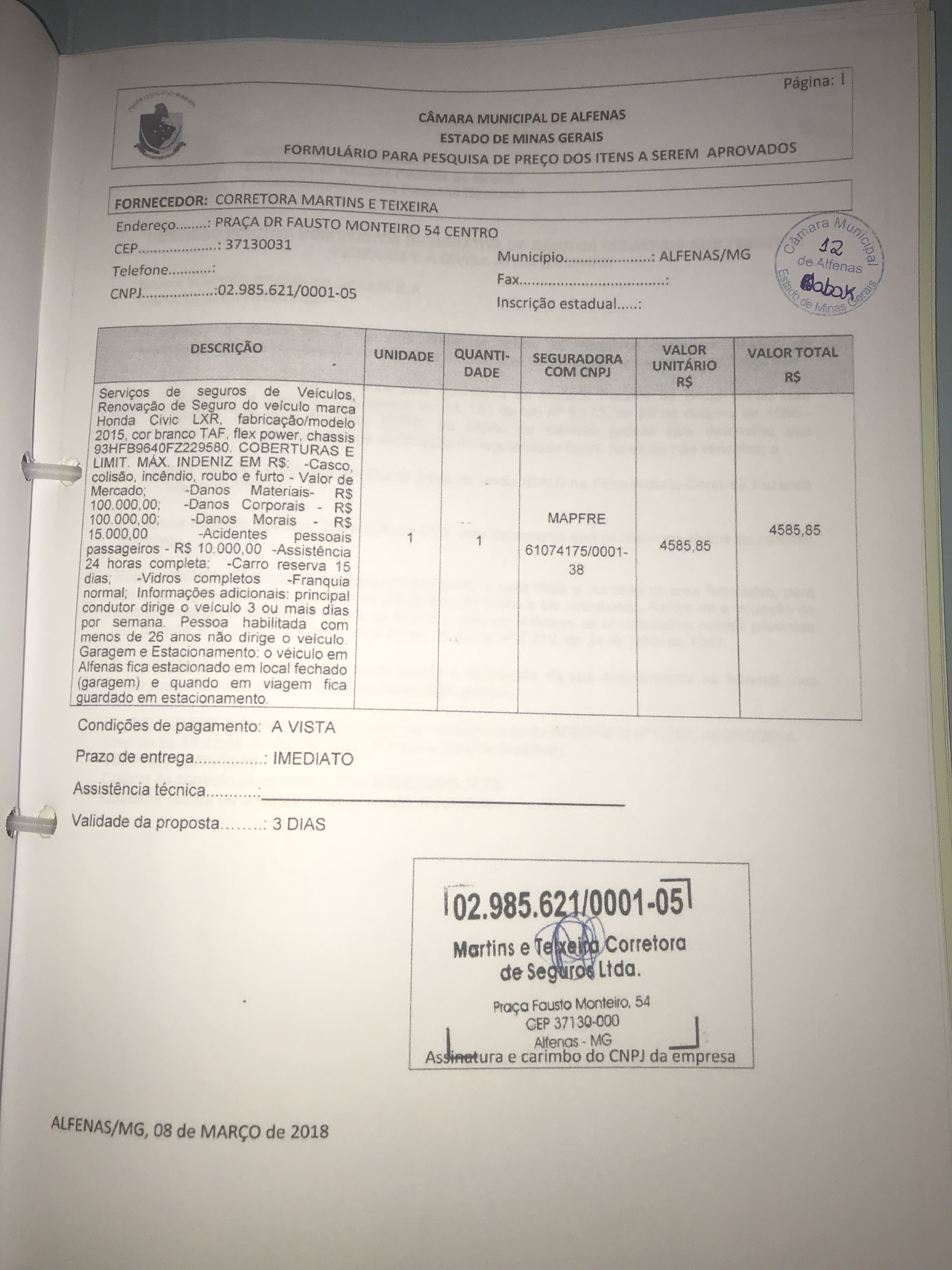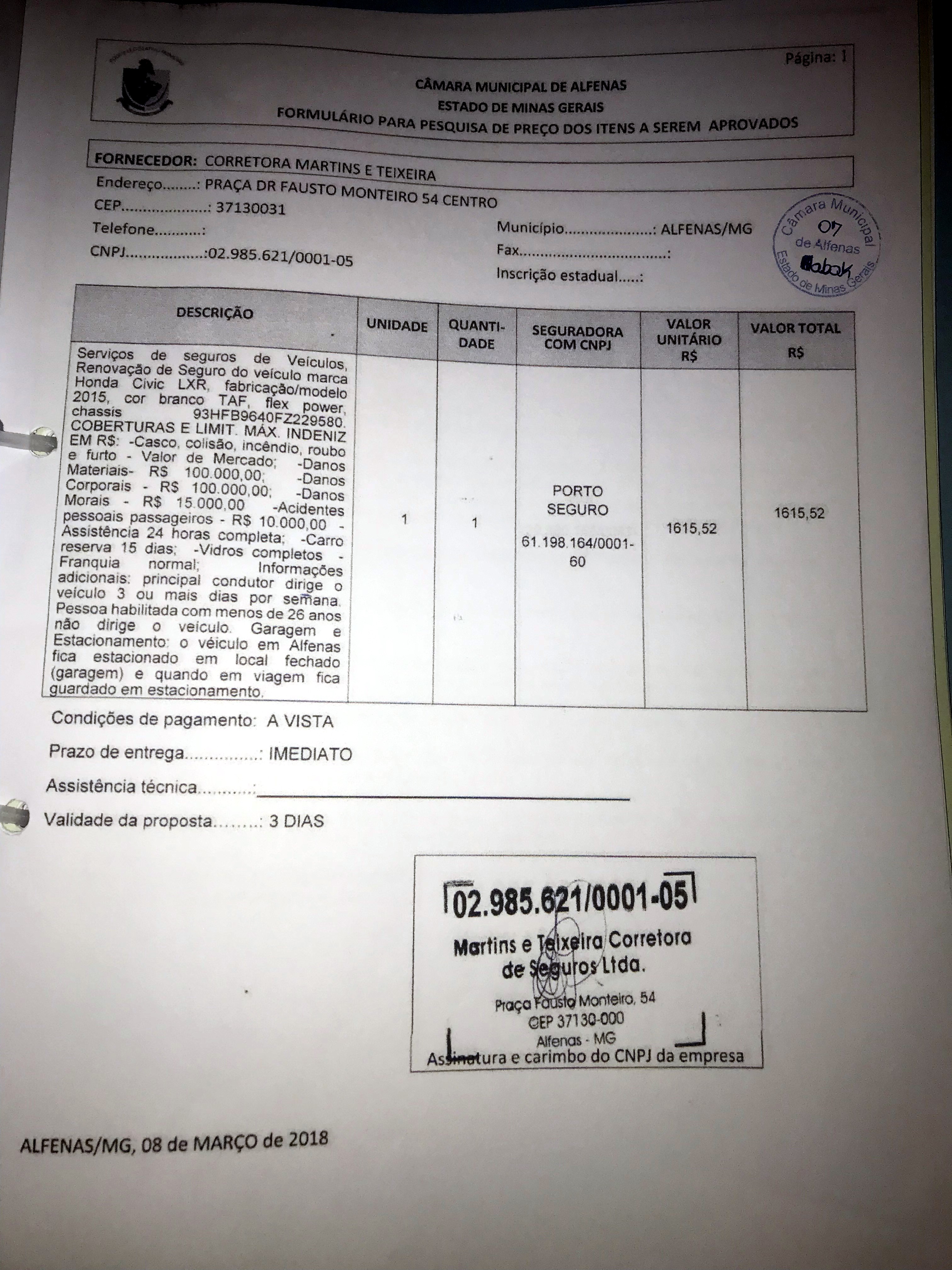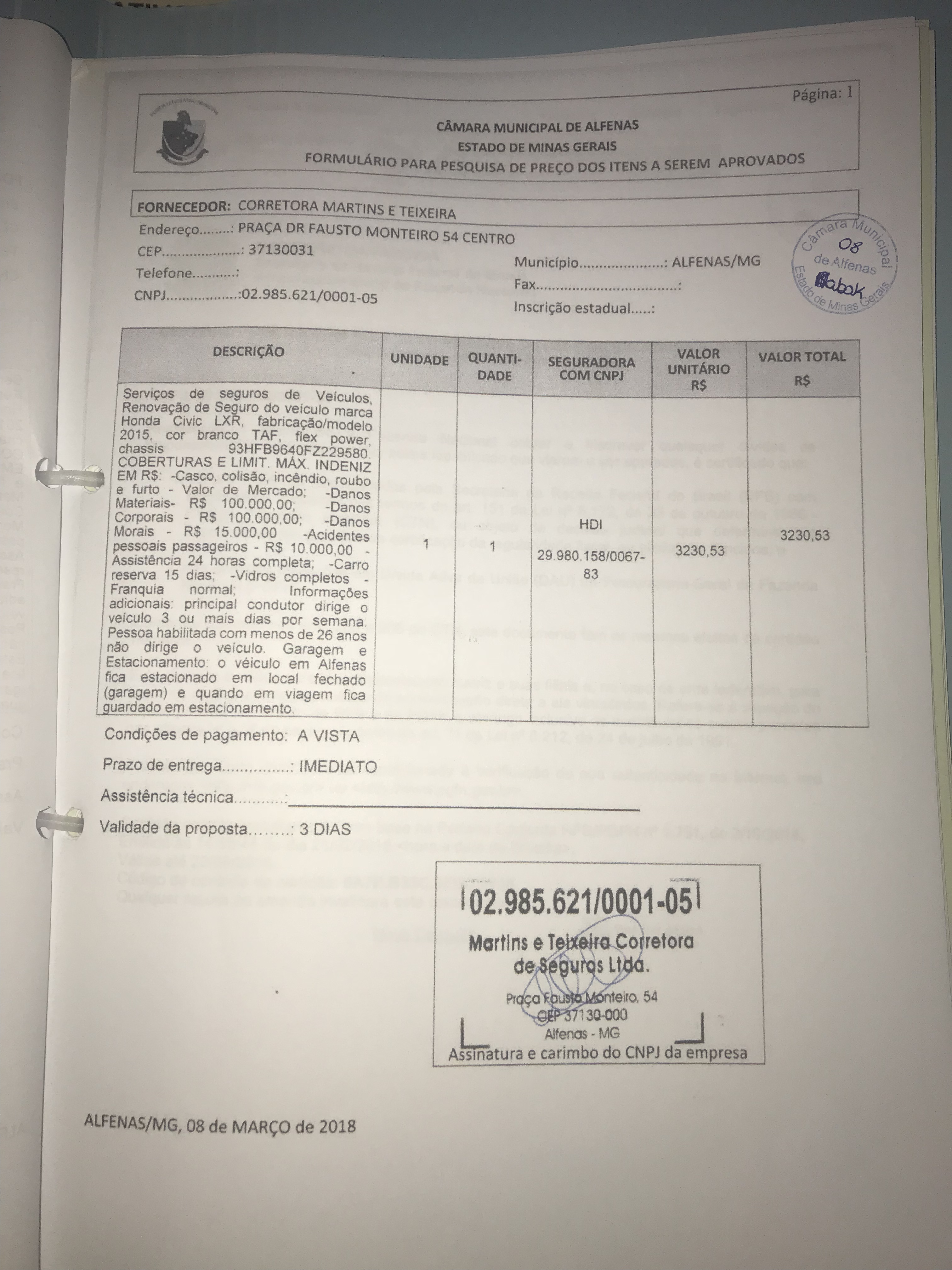 Contratação de seguro para o veículo Honda Civic placa PVT 1101 de propriedade desta Casa Legislativa