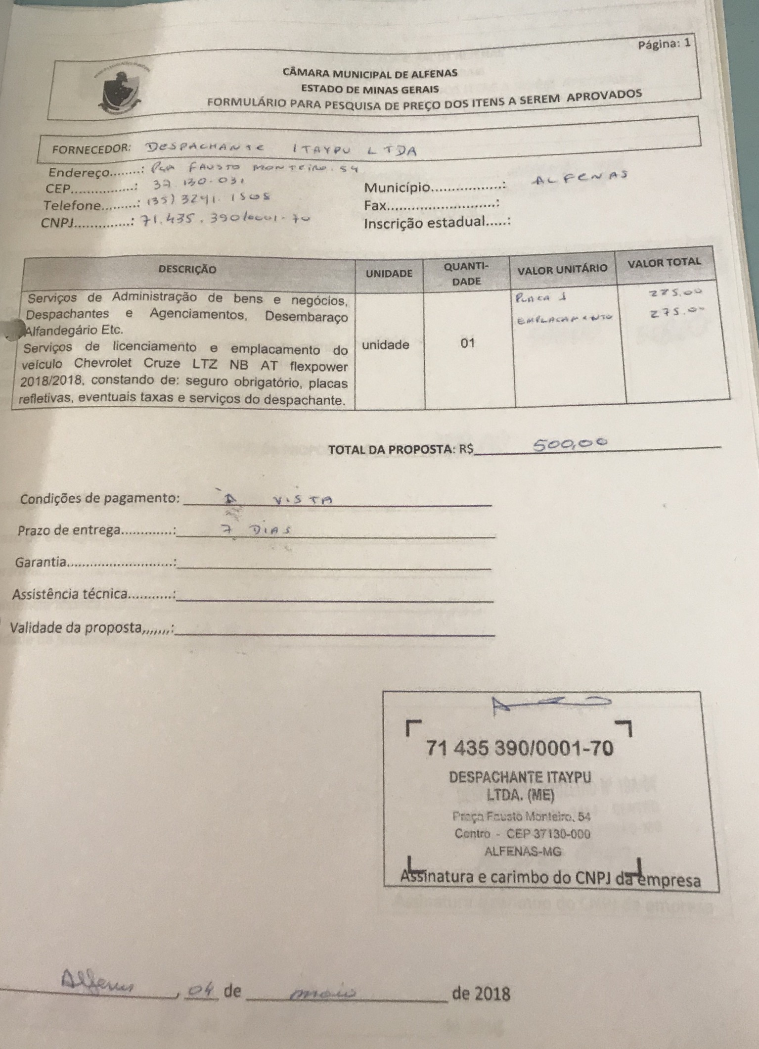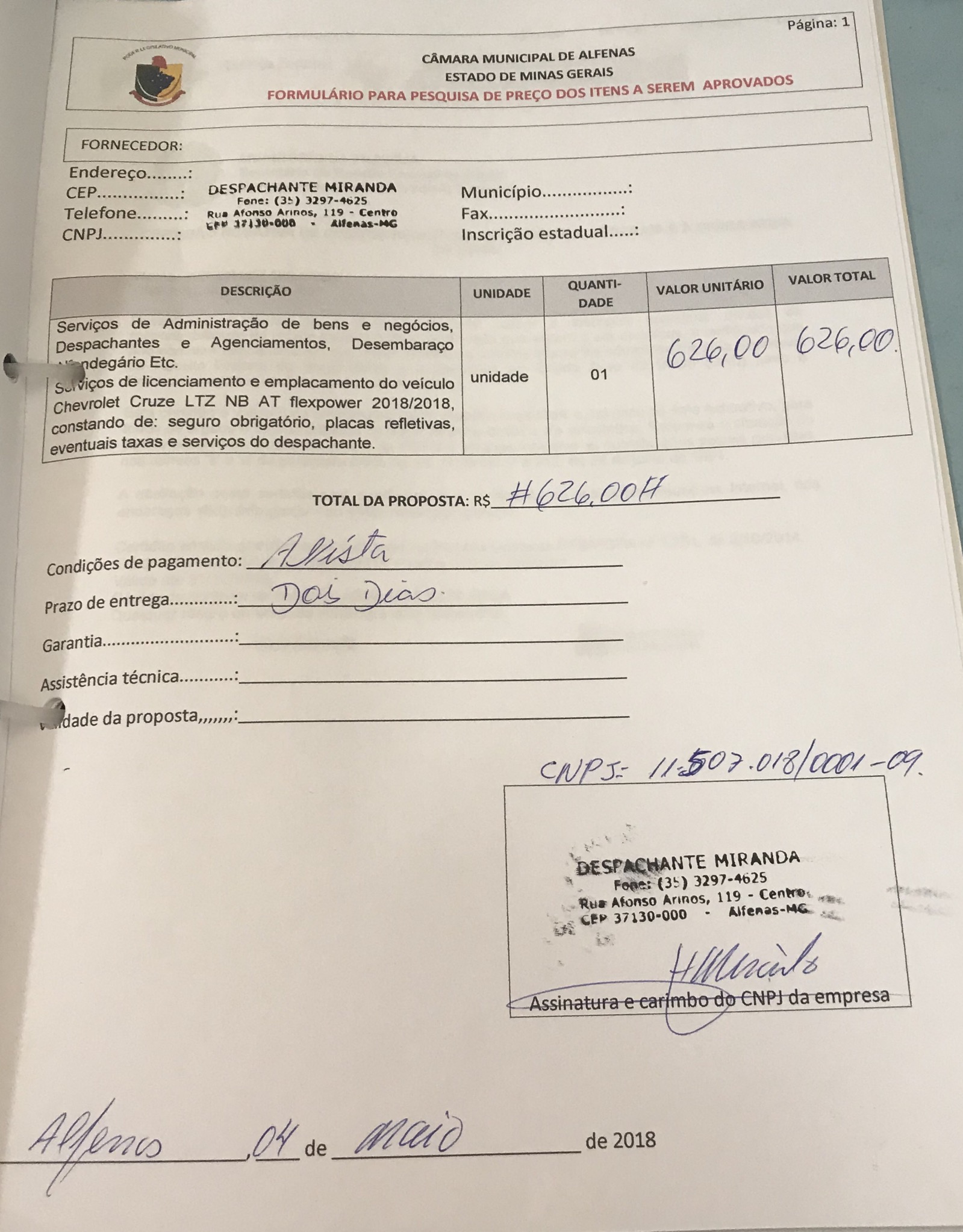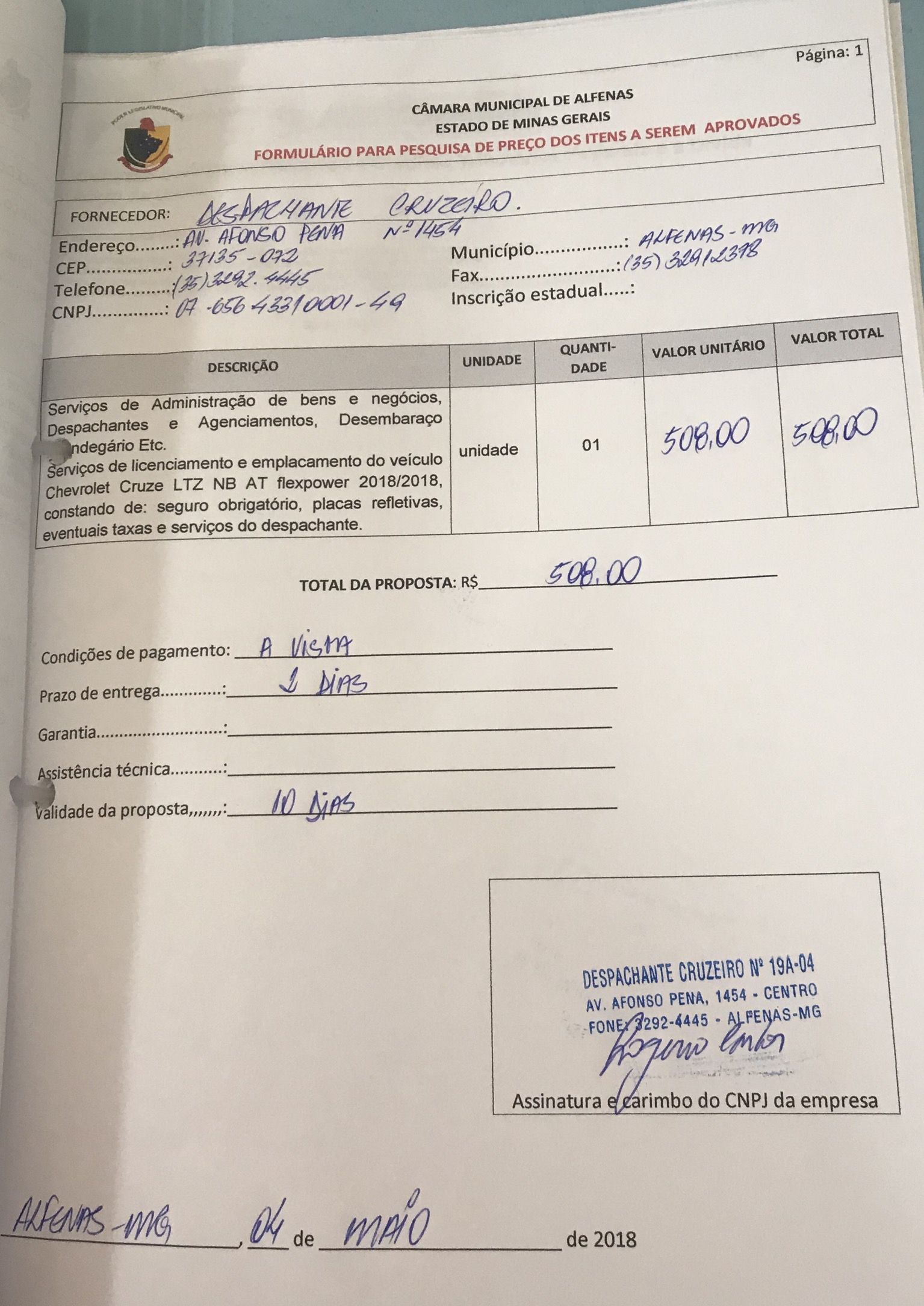 Licenciamento e emplacamento do veículo Chevrolet Cruze zero km de propriedade da Câmara Municipal de Alfenas